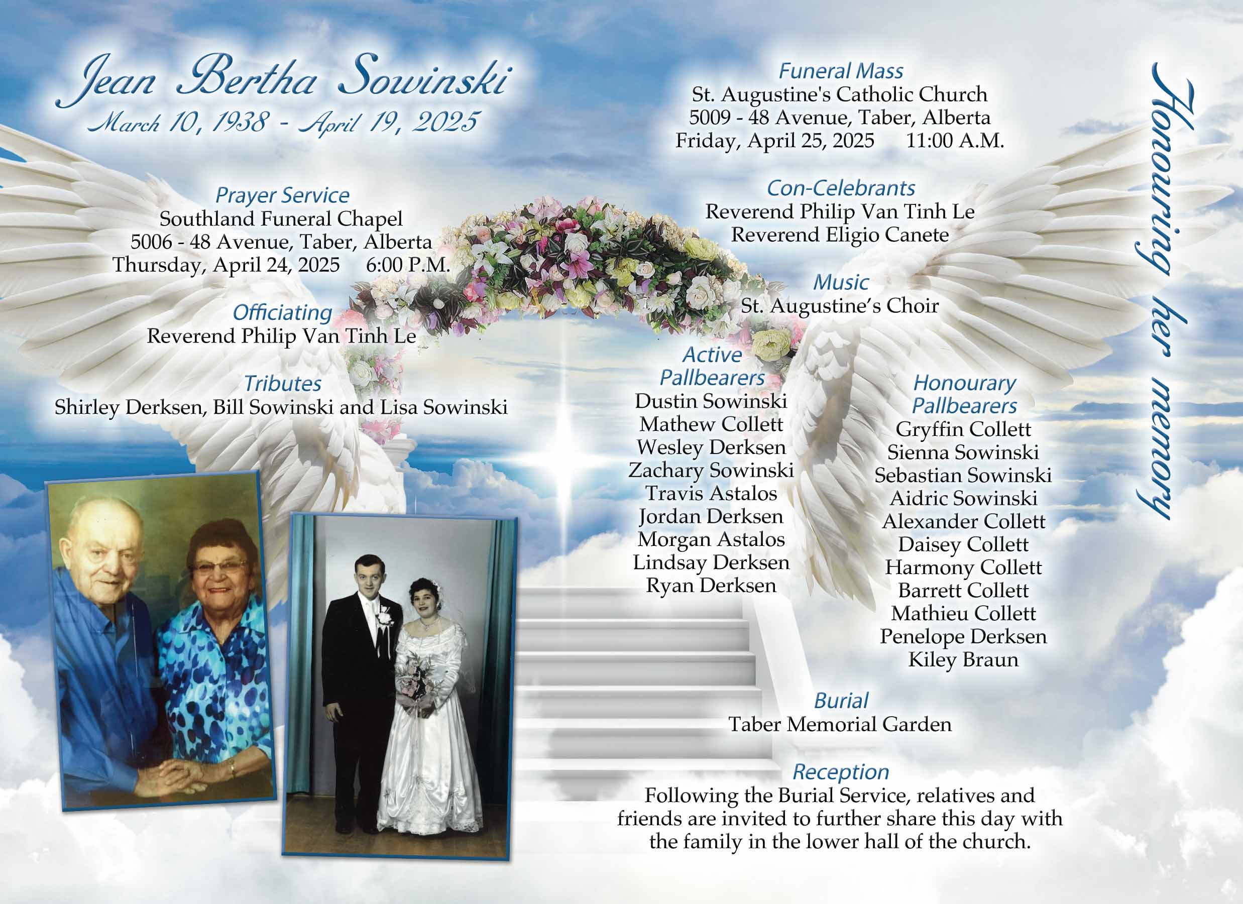 The Funeral Mass was celebrated at St. Augustine's Catholic Church, 5009 - 48 Avenue, Taber on Friday, April 25, 2025 at 11:00 A.M. Burial followed at the Taber Memorial Garden.