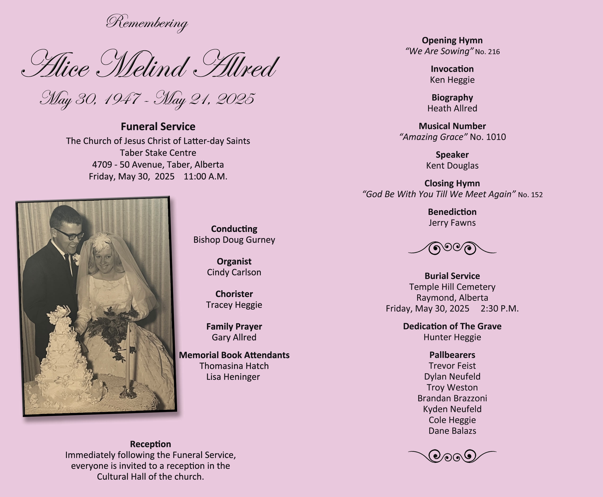 The Funeral Service was held at The Church of Jesus Christ of Latter-day Saints, Taber Stake Centre, 4709 – 50 Avenue, Taber on Friday, May 30, 2025 at 11:00 A.M. The Burial Service was held at the Temple Hill Cemetery, Raymond at 2:30 P.M.