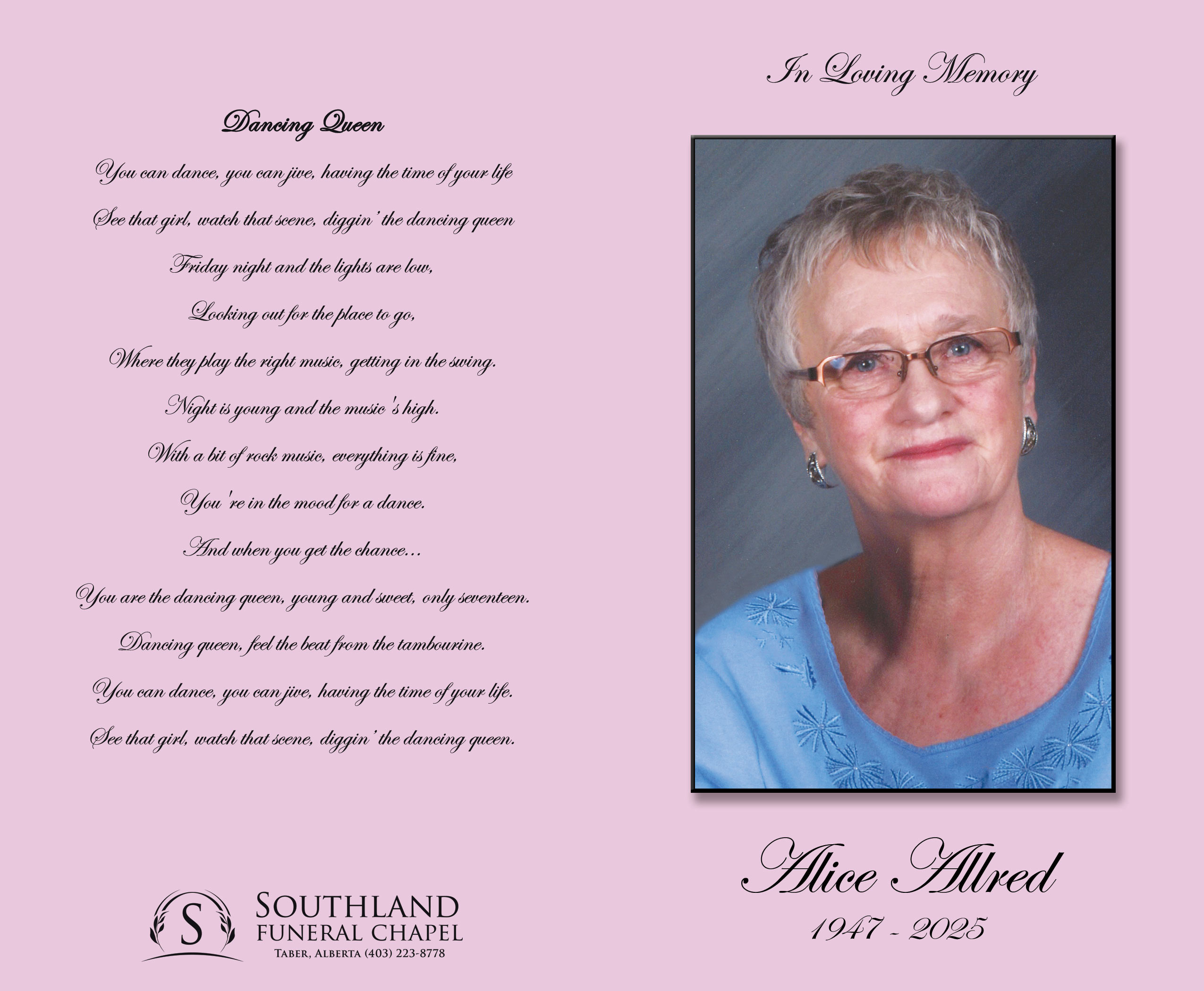 Relatives and friends were invited to meet with the family at Southland Funeral Chapel, 5006 - 48 Avenue, Taber on Thursday, May 29, 2025 between 7:00 P.M. and 8:00 P.M. and also at the church prior to the funeral service on Friday, May 30, 2025 between 10:00 A.M. and 10:40 A.M.