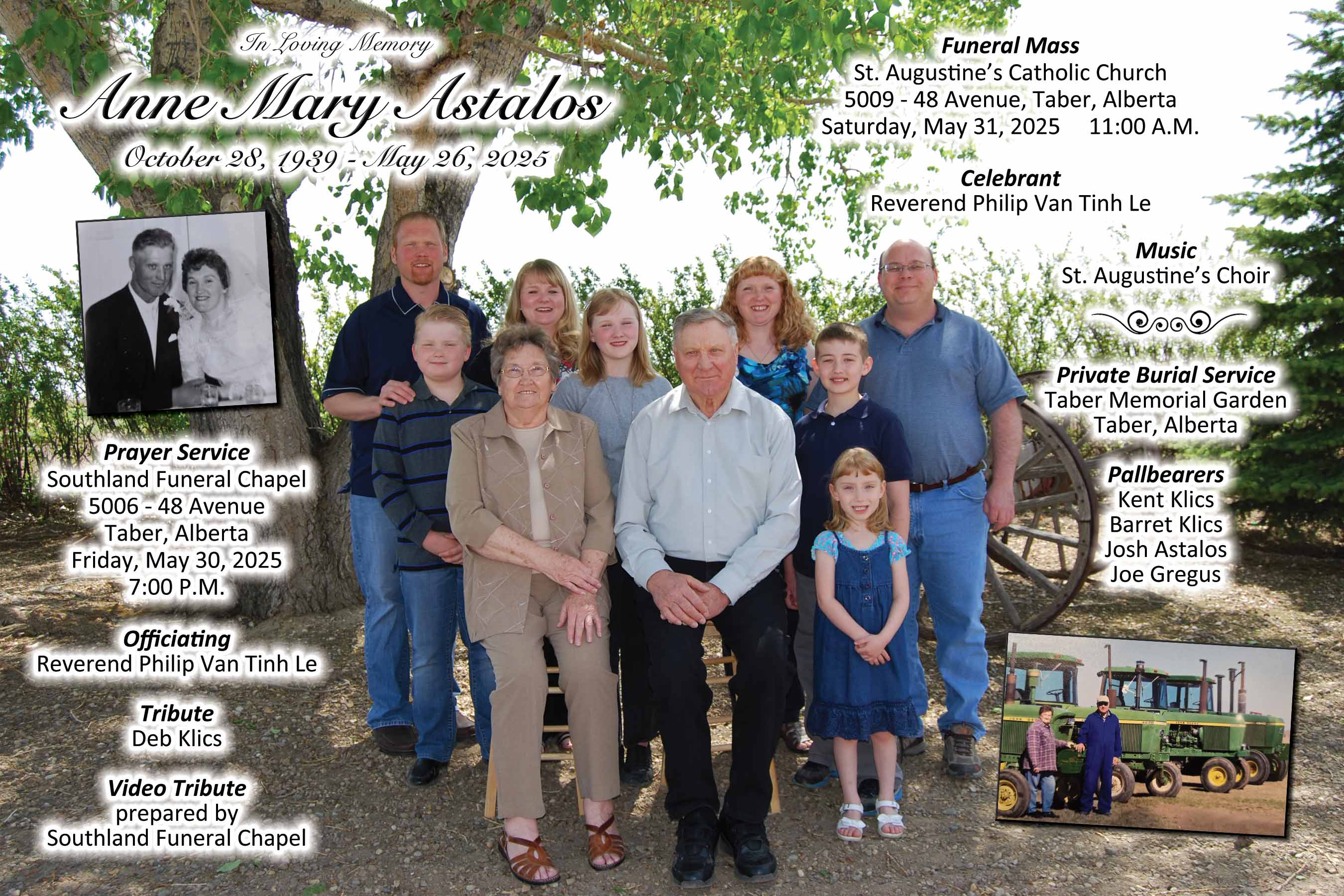 The Funeral Mass were celebrated at St. Augustine's Catholic Church, 5009 - 48 Avenue, Taber on Saturday, May 31, 2025 at 11:00 A.M. Private burial followed at the Taber Memorial Garden.