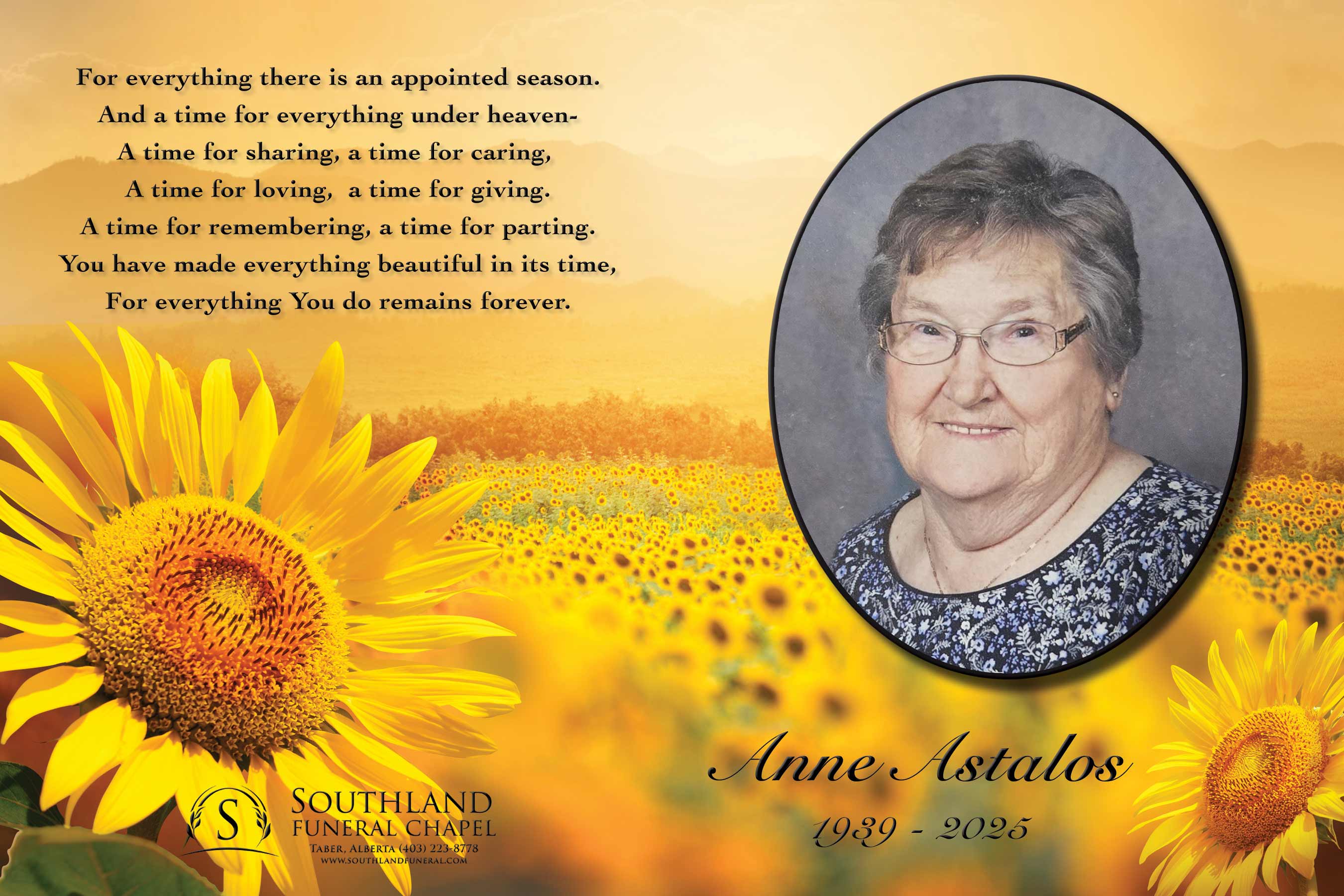 Relatives and friends were invited to Prayers at Southland Funeral Chapel, 5006 - 48 Avenue, Taber on Friday, May 30, 2025 at 7:00 P.M.