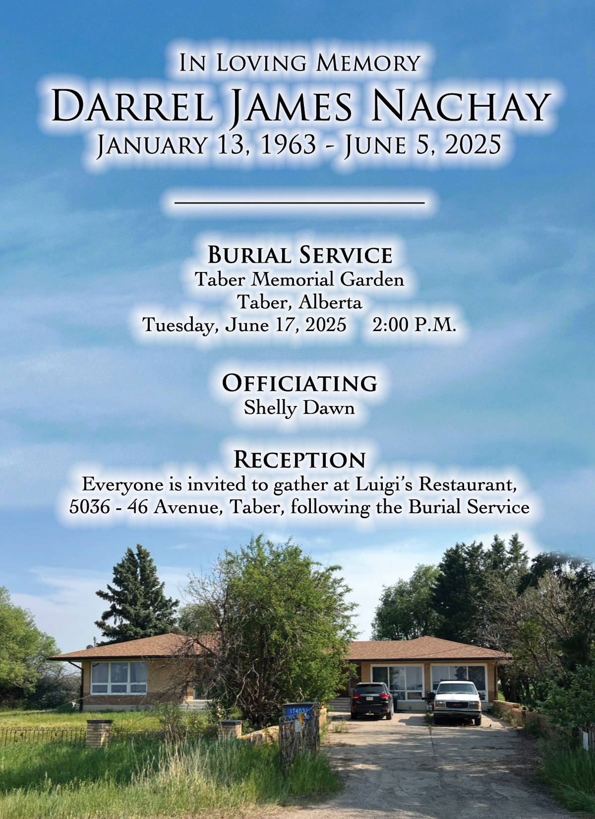 The Burial Service was held at the Taber Memorial Garden, 7600 - 50 Street, Taber on Tuesday, June 17, 2025 at 2:00 P.M. with Life Celebrant Shelly Bassett officiating. A celebration of Darrel’s life followed at Luigi’s Restaurant, 5036 - 46 Avenue, Taber.