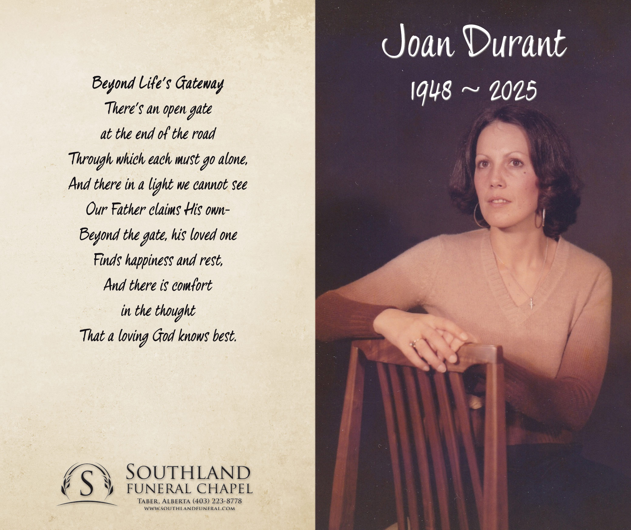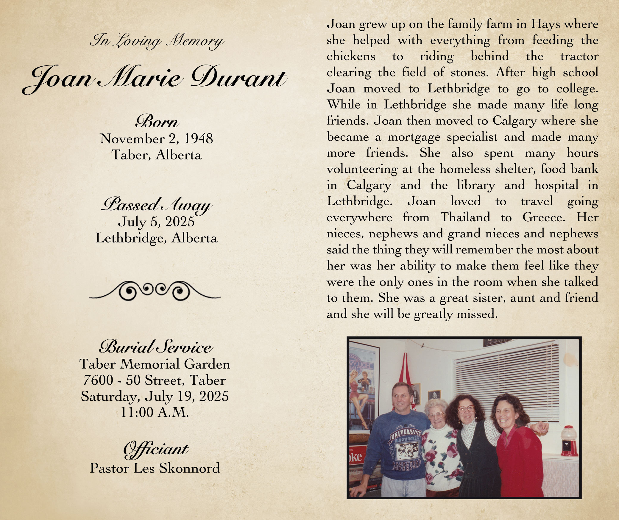 It is with heavy hearts that we announce the passing of Joan Marie Durant (née Meikle) in Lethbridge on Saturday, July 5, 2025 at the age of 76 years.