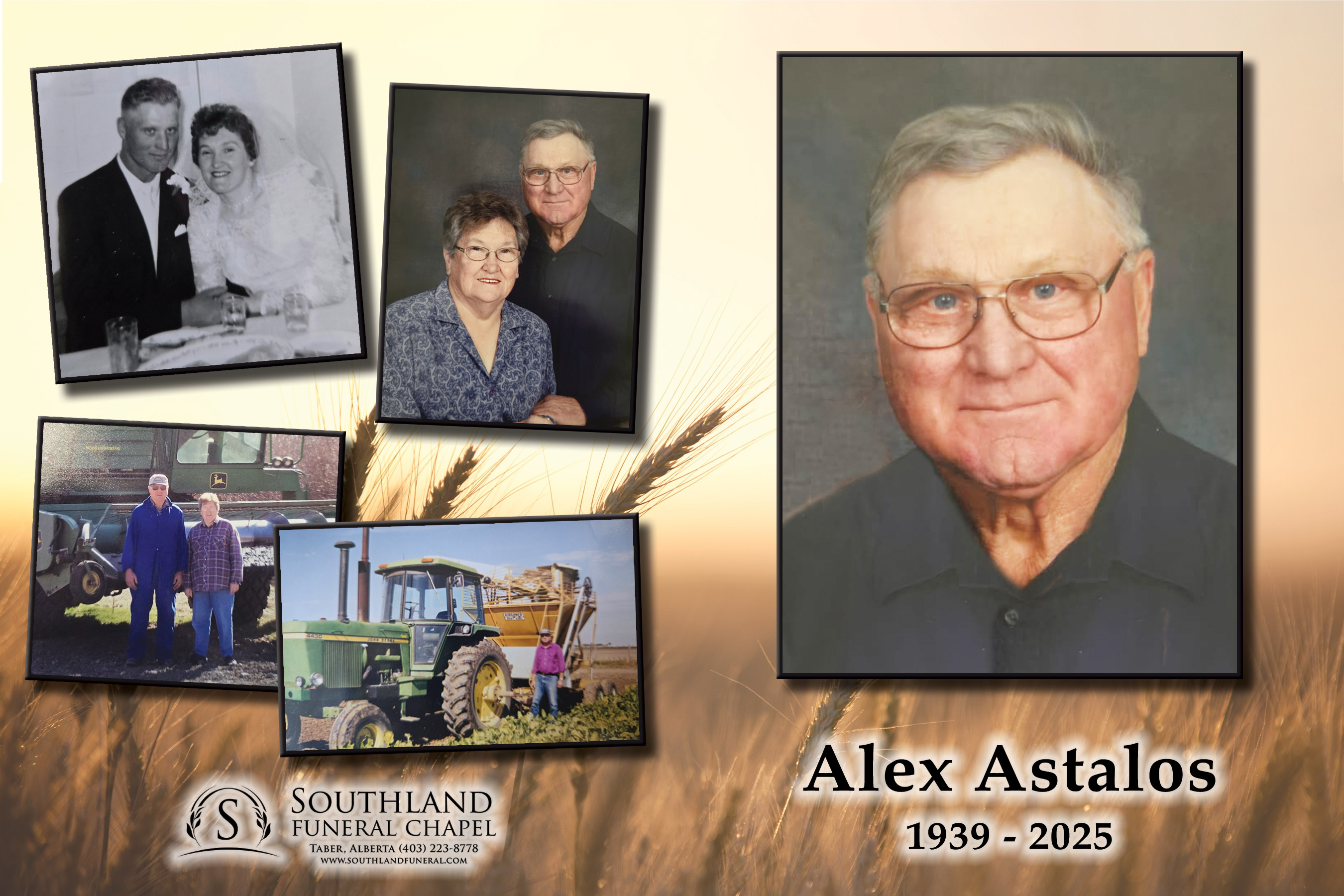 Alex was born on August 19, 1939, in Lethbridge three months premature. He grew up on the farm and at the age of fourteen he began farming with his brother Joe and father. Alex met his wife Anne while cruising the streets of Taber and they were married in May of 1962. In 1965 they bought eighty acres from his father, southeast of Taber where they built the family farm and resided until 2010. Alex took great pride and care in farming and maintaining his equipment. In the early years he worked at the sugar factory in the winter, in the sugar warehouse loading 100lb sugar bags into railcars manually. His hands told the story of strength and a life building, growing and giving. He was a devoted father and grandfather. He always made time for the grandkids, from riding on the farm hand to making a snow hill every winter for them to sled down. Alex loved “Dad” jokes and had a nickname for everybody. He was known for his kindness and quiet strength. Alex believed in hard work, honesty and helping his neighbour. On the farm Alex grew corn, peas and beans for Empress foods. He loved growing sugar beets and won high tonnage awards in the early 2000's. He even dug beets for the sugar factory after research plots were complete.