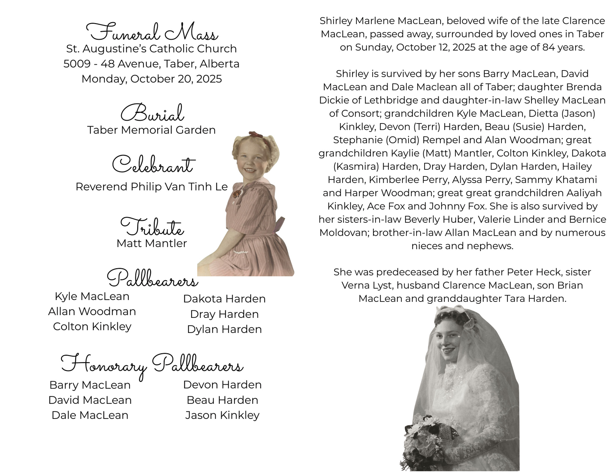 The Funeral Mass was celebrated at St. Augustine’s Catholic Church, 5009 - 48 Avenue, Taber on Monday, October 20, 2025 at 11:00 A.M. Private burial followed at Taber Memorial Garden.