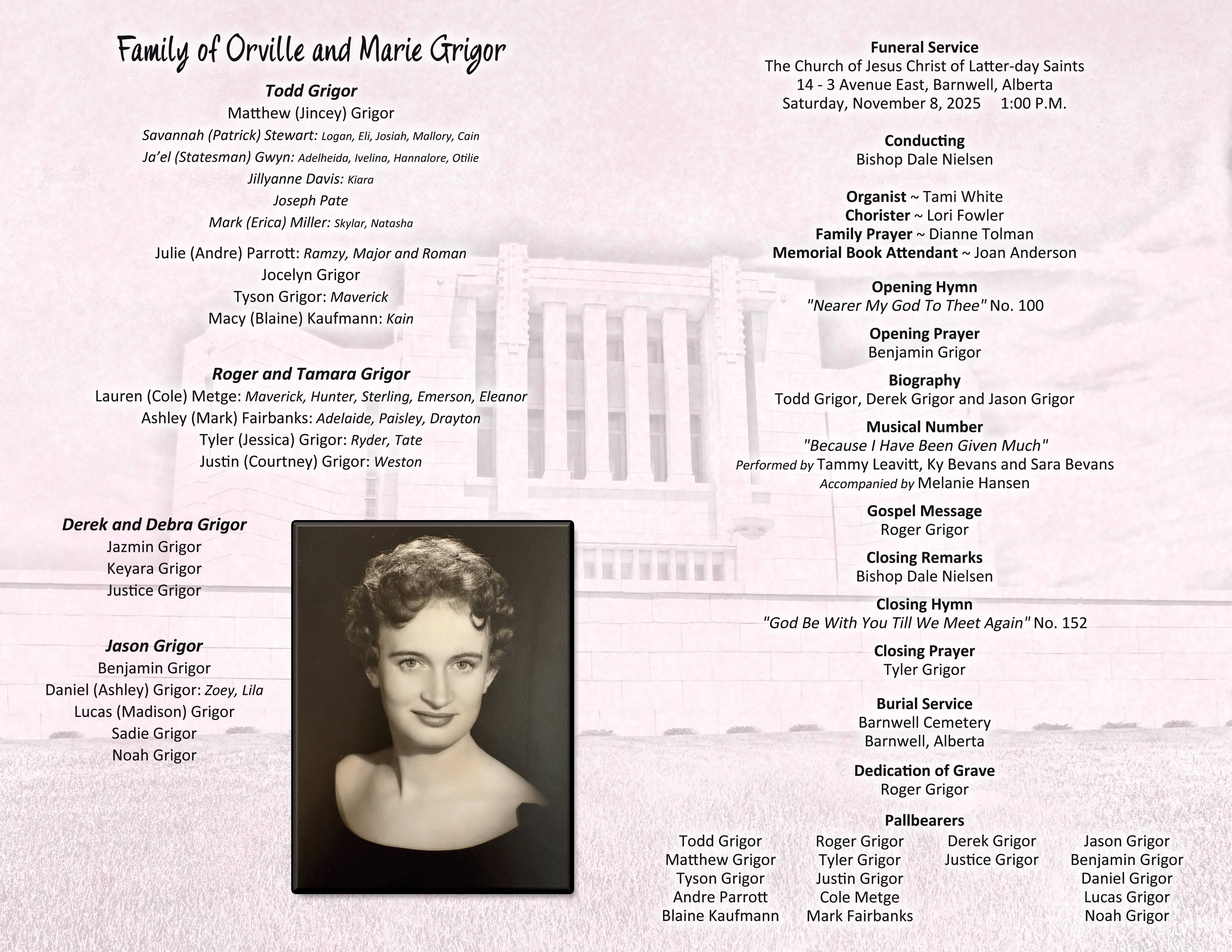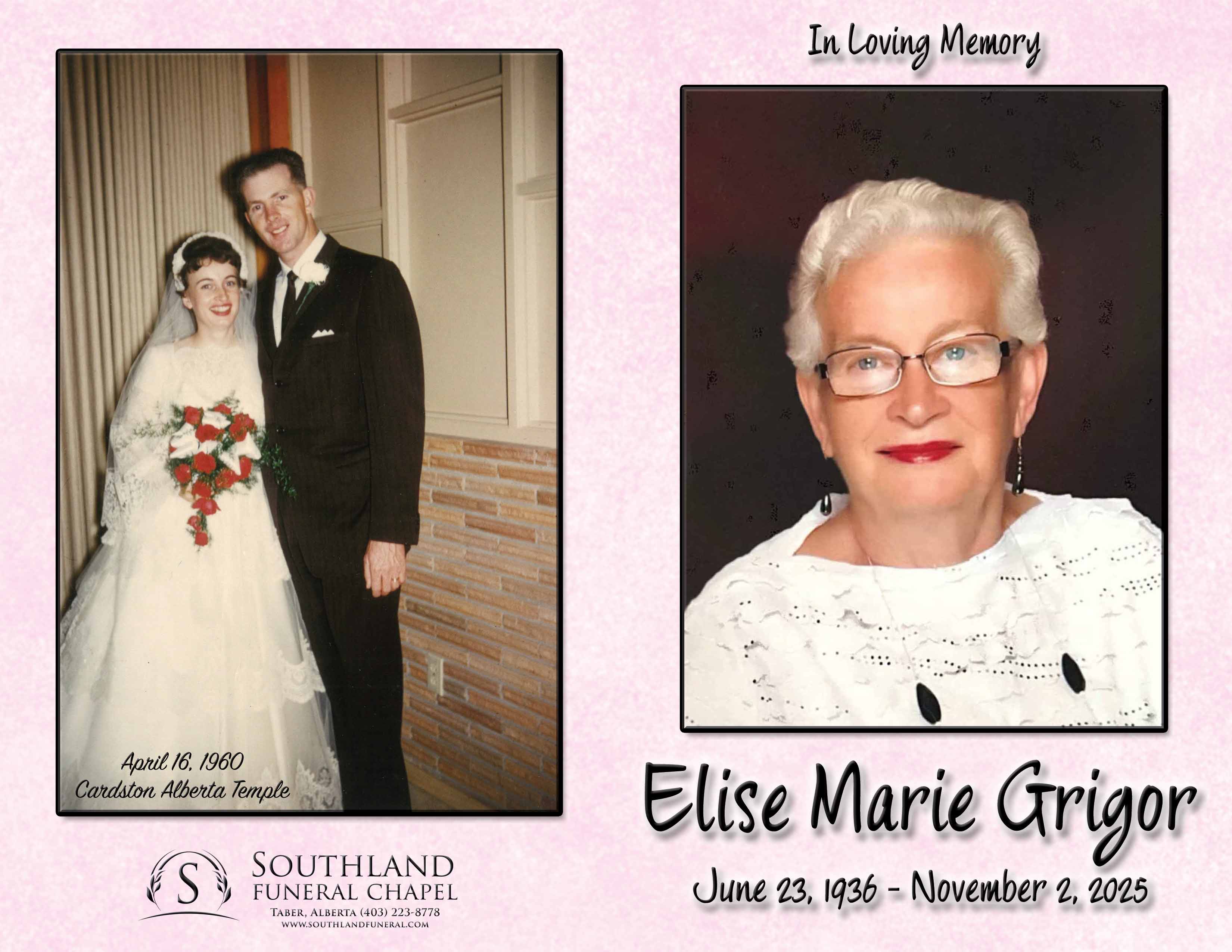 Elise Marie Grigor (née Shields), lovingly known as Marie, passed away peacefully in Cardston on Sunday, November 2, 2025 at the age of 89 years.