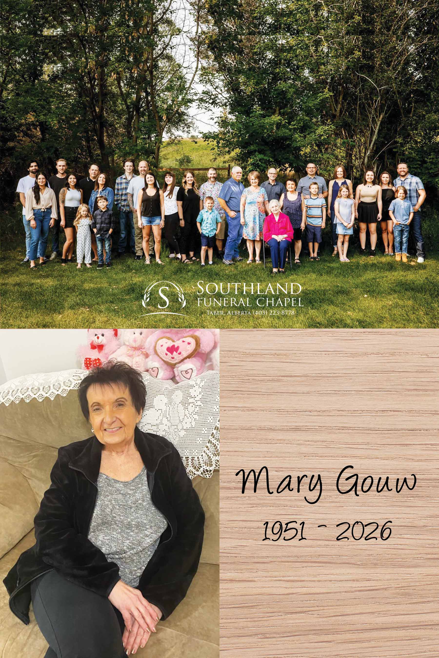 Mary Gouw (née Djani), beloved wife of Bill Gouw, passed away peacefully, in Taber during the early morning hours on Tuesday, January 6, 2026 at the age of 74 years, with Bill at her side.