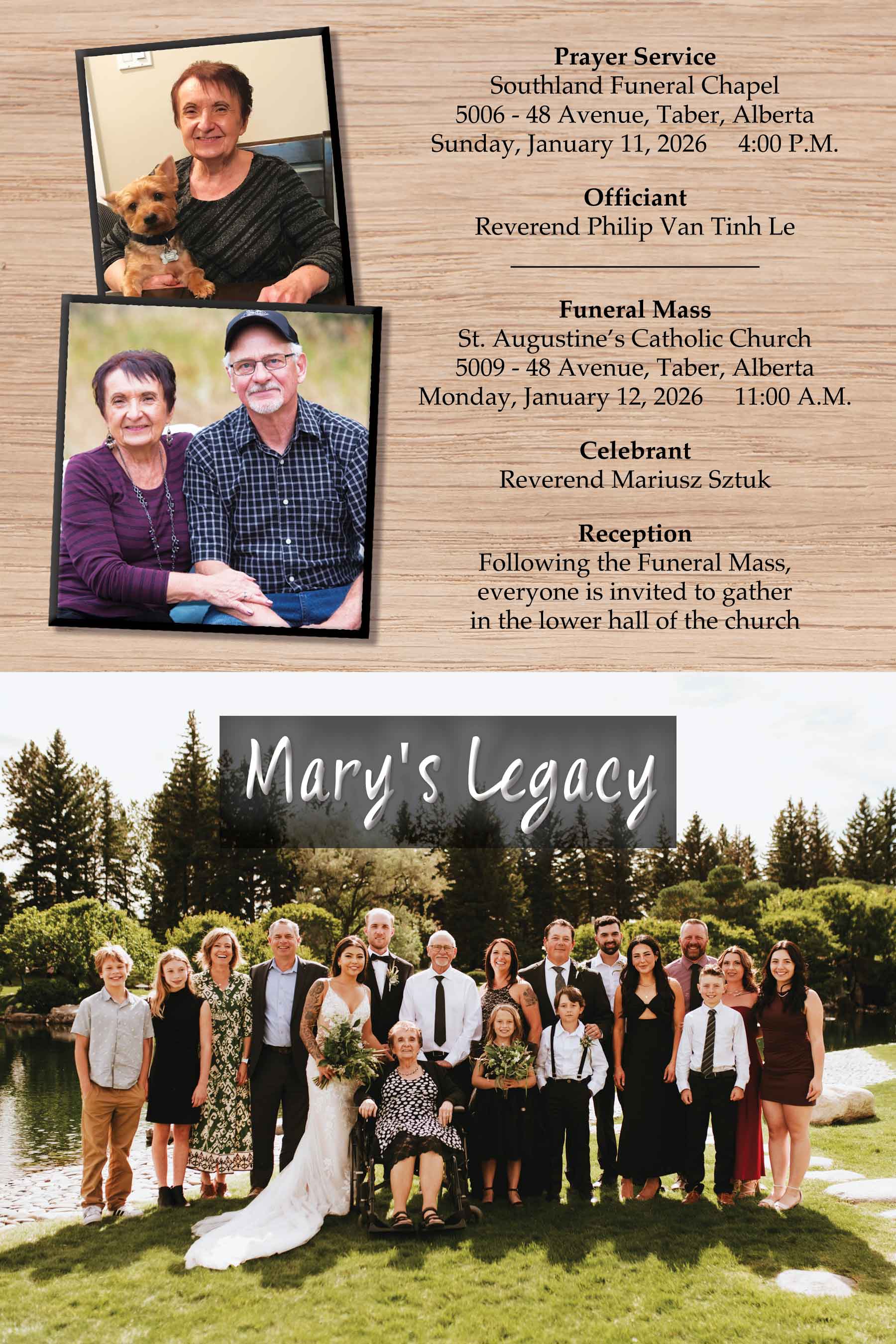The Funeral Mass was celebrated at St. Augustine’s Catholic Church, 5009 - 48 Avenue, Taber, on Monday, January 12, 2026 at 11:00 A.M.