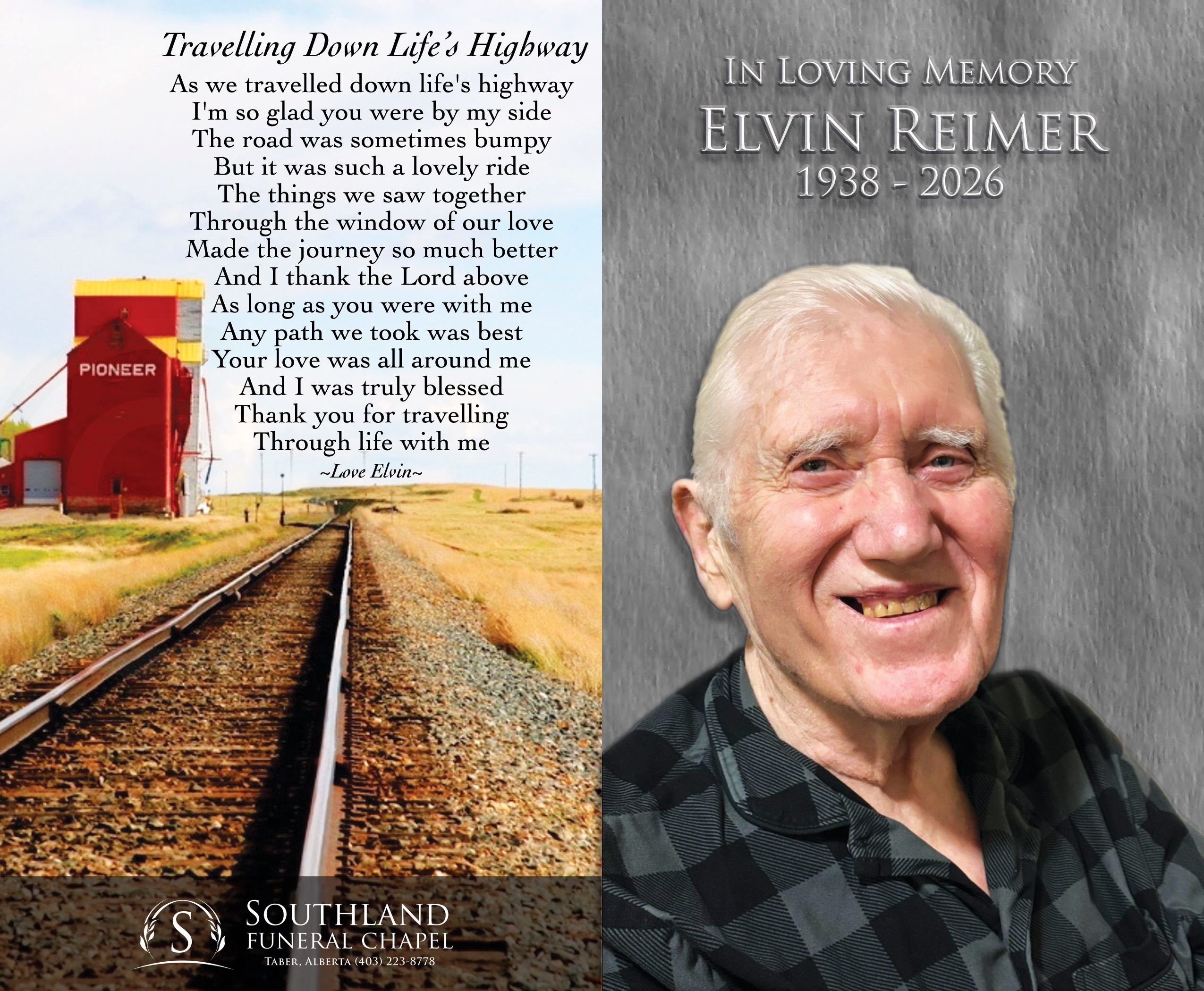 Elvin F. Reimer, beloved husband of the late Tina Reimer (née Kornelsen), passed away peacefully in Lethbridge, surrounded by his family, on Saturday, February 14, 2026 at the age of 87 years.