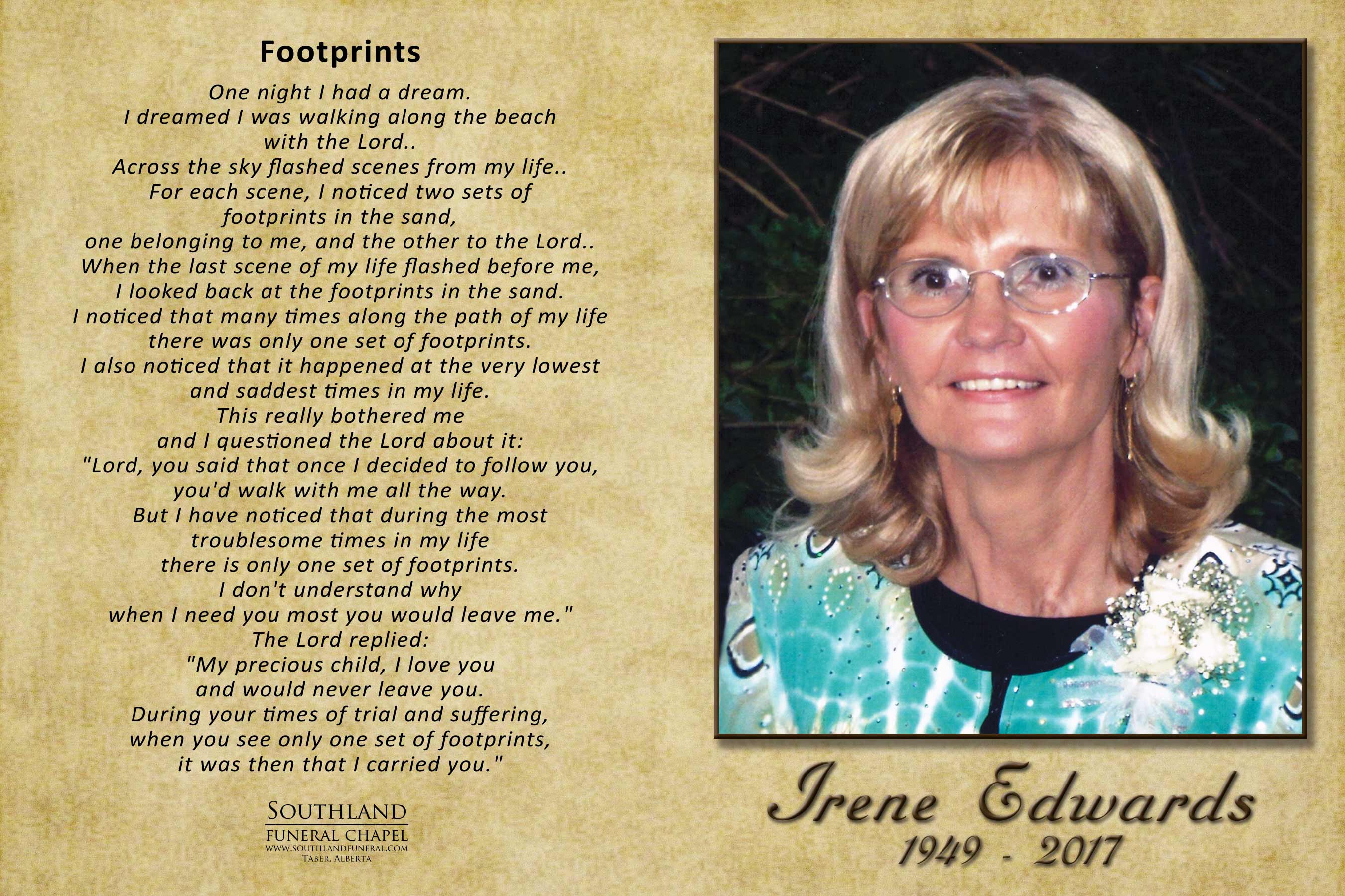 Irene Elizabeth Edwards, beloved wife of Harold Edwards, passed away peacefully, surrounded by her family in Taber on Tuesday, January 3, 2017 at the age of 67 years.