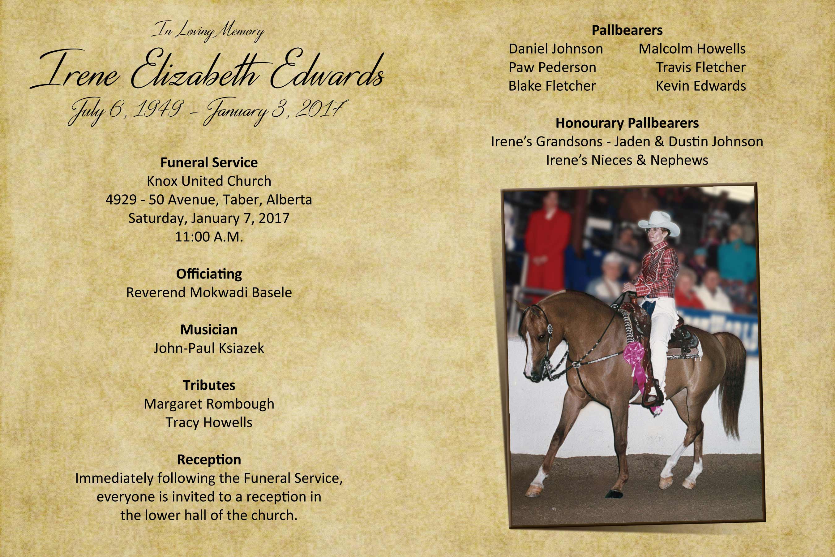 Besides her loving husband Harold, Irene is survived by their son Brad (Keri-Ann) Edwards of Taber, daughter Michel (Daniel) Johnson of Taber and their children Jaden and Dustin; brother Andy (Judy) Astalos of Sylvan Lake, brother-in-law John DeBona of Lethbridge and by numerous nieces and nephews.