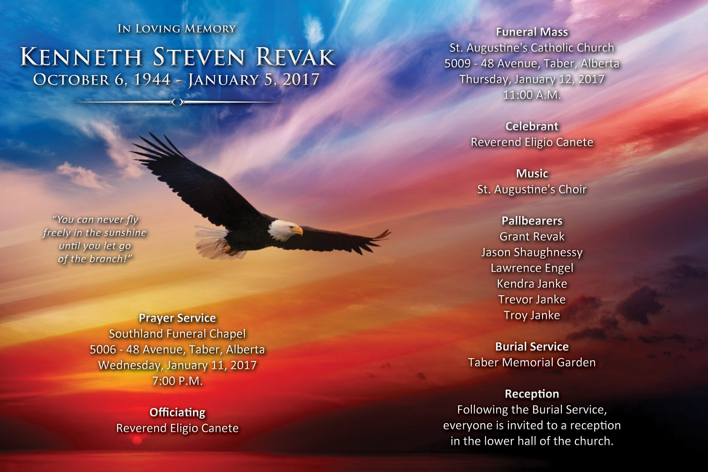 The Funeral Mass was celebrated at St. Augustine's Catholic Church, 5009 - 48 Avenue, Taber on Thursday, January 12, 2017 at 11:00 A.M. Burial followed at the Taber Memorial Garden.