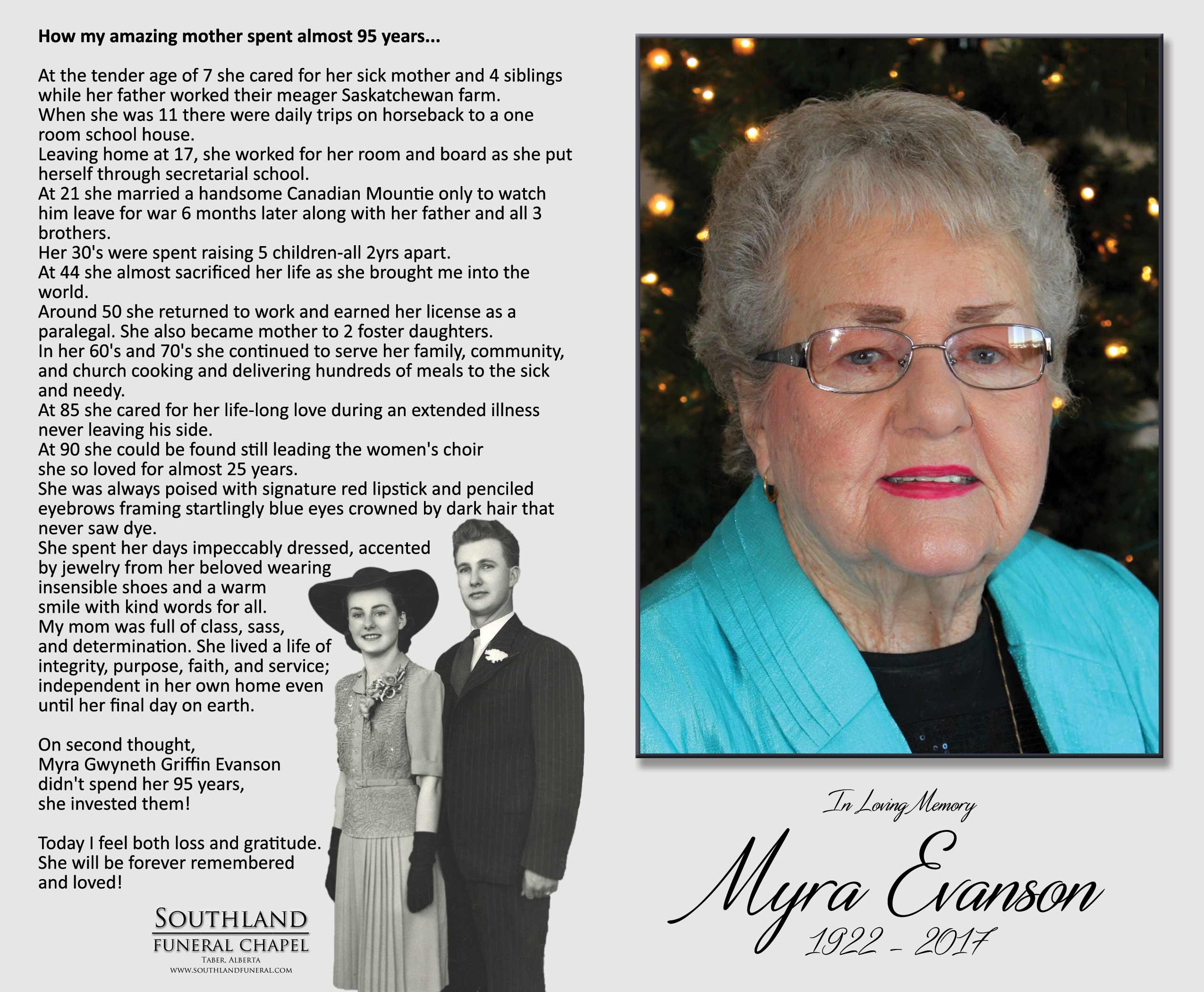 Myra Gwyneth Griffin Evanson was born July 31, 1922 in Swift Current, Saskatchewan to Charles and Margaret (Madge) Griffin. Myra and her four siblings grew up on a farm outside of Swift Current where she learned to work hard from an early age. Upon completing high school she moved to Regina to take a business course, which eventually landed her a job back in Swift Current working for the government during the War. It was there that she met the great “love of her life” Ray Evanson who was stationed in the area with the RCMP. Their first date was on Valentine’s Day and through the course of their marriage, Ray gave her a dozen red roses every February 14 until his passing in 2006. After marrying and relocating to Taber, she was alone while Ray was stationed in England. When he returned, they started a family and raised their first five children in Taber. Ray and Myra moved to Atlanta, Georgia in 1965 where they presided over the Southern States Mission for the Church of Jesus Christ of Latter Day Saints. While serving in this assignment, Cathy was born. Upon returning to Taber in 1968, Myra continued to be a wonderful mother while doing tremendous service in the church and community. She went back to work as a paralegal and worked for Peterson & Purvis Law Firm for many years. Myra loved music and sang with and lead the Choralaires until her passing. She was a fantastic cook, found joy in sharing that talent with others and loved working in the yard. Myra was generally happiest when busy and always rated her day by how much she accomplished. She continued to live in her home until her passing. Myra was an example of integrity, compassion, service and love to everyone. We will miss her terribly but are content knowing she is finally re-united with Ray and all those loved ones who have gone on before.
