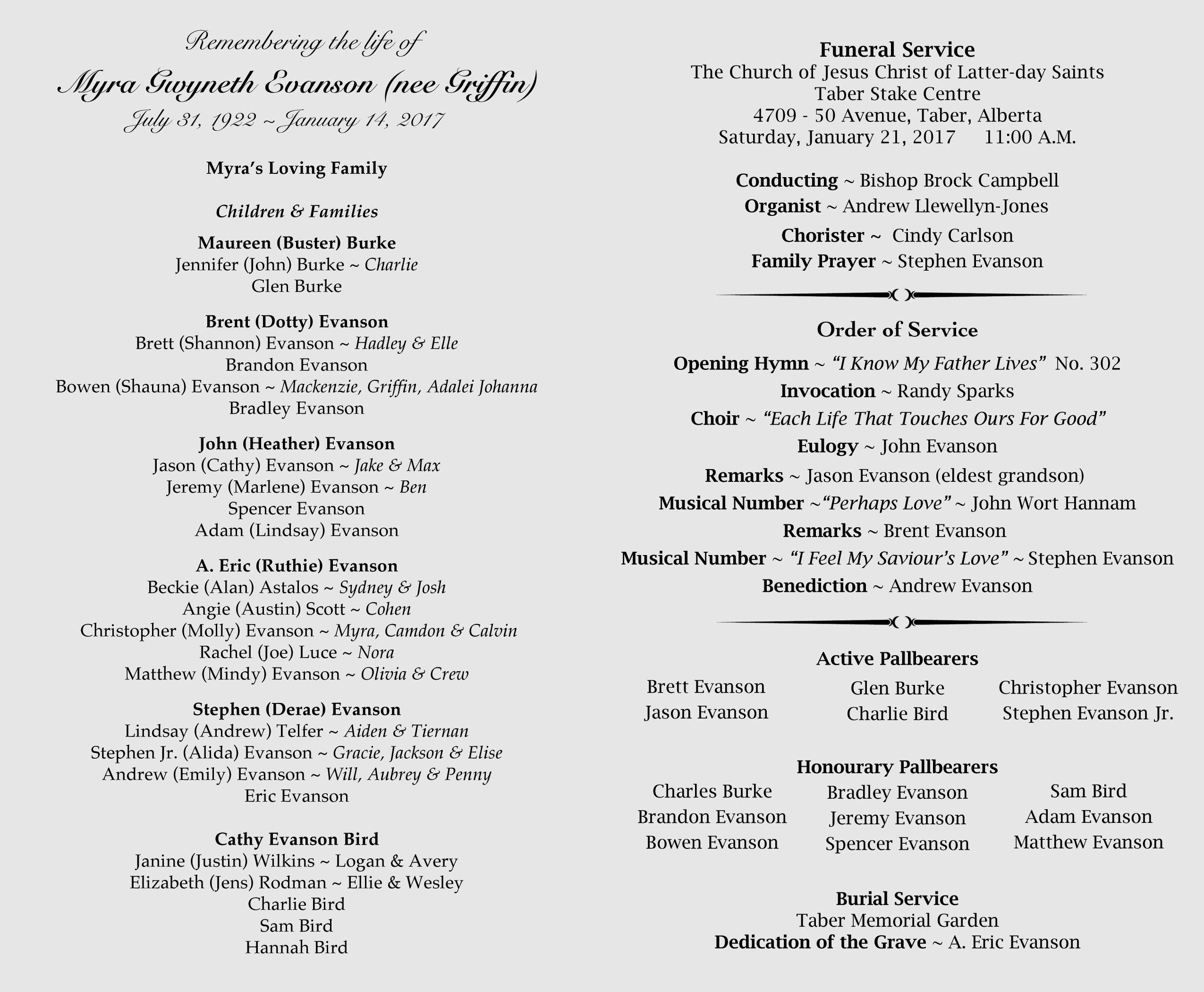 The Funeral Service was held at The Church of Jesus Christ of Latter-day Saints, Taber Stake Centre, 4709 - 50 Avenue, Taber on Saturday, January 21, 2017 at 11:00 A.M. Burial followed at the Taber Memorial Garden.
