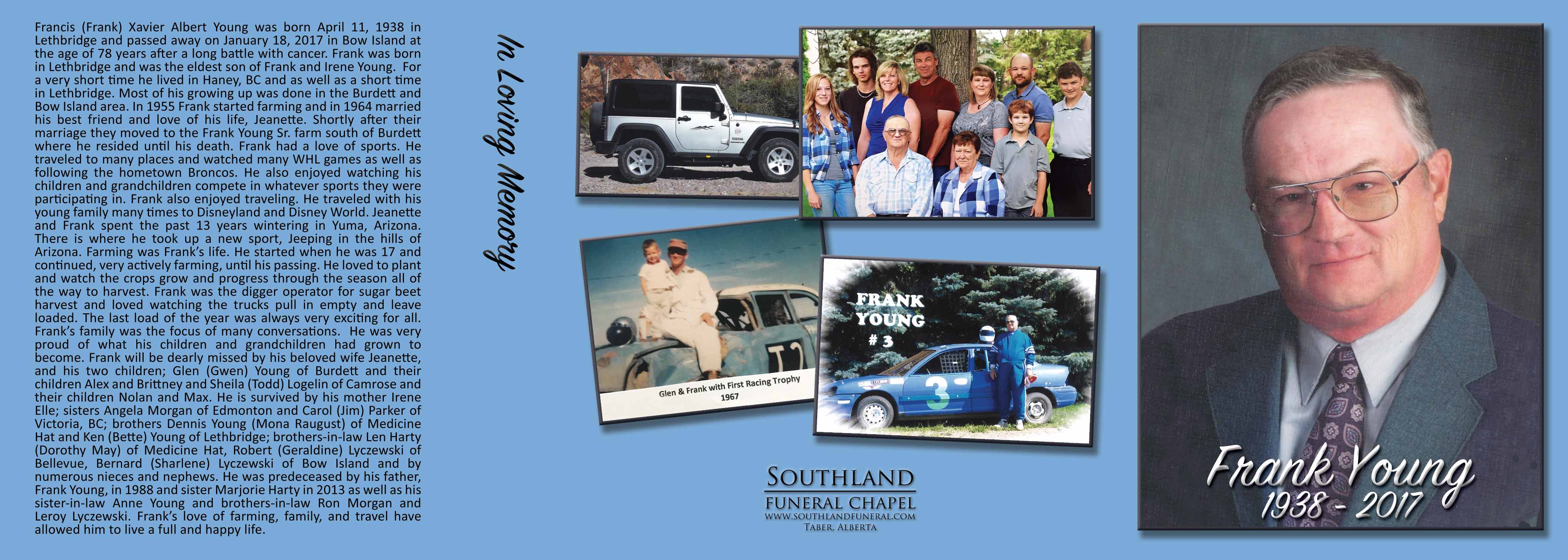 Frank Young, beloved husband of Jeanette Young (nee Lyczewski), passed away in Bow Island on Wednesday, January 18, 2017 at the age of 78 years after a long battle with cancer.