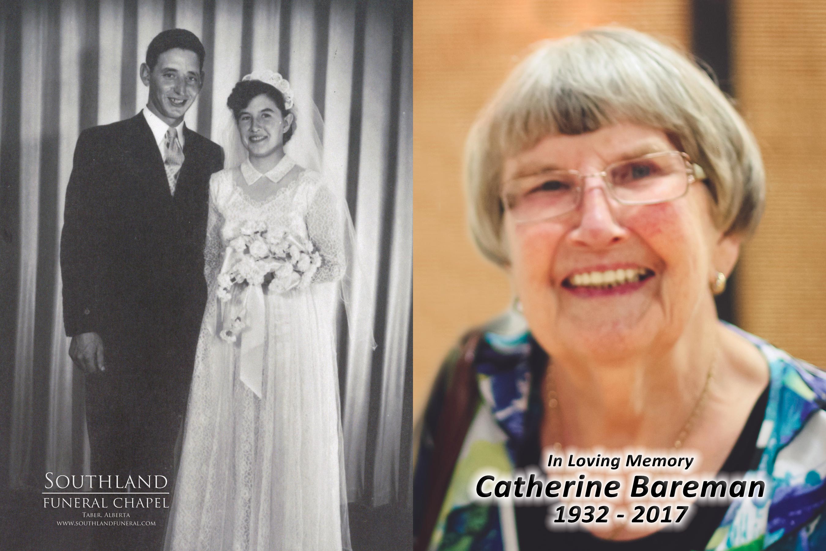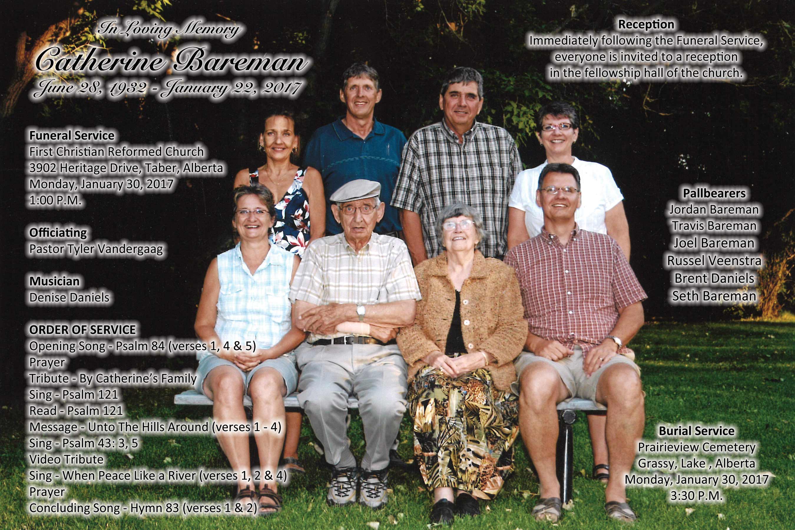 Catherine is survived by her six children John Bareman of Taber, Marion (Jeanette) Bareman of Grassy Lake, Cora (Jerry) Bareman-Hall of Taber, Ann (Wayne) Veenstra of Taber, Debbie (Derk) Daniels of Taber and Jim (Stephanie) Bareman of Lynden, Washington; twenty seven grandchildren and thirty great grandchildren. She is also survived by her brothers Fre (Jo) Verschelling and Adri (Saar) Verschelling, sisters Gre Vandevoorst and Janneke Verschelling (Cor) and brother-in-law Adri Dommisse of The Netherlands and by numerous nieces and nephews.