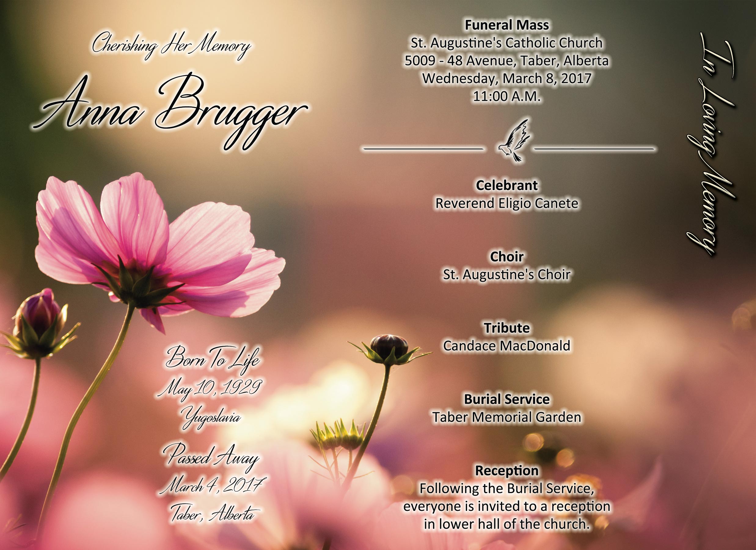 The Funeral Mass was celebrated at St. Augustine's Catholic Church, 5009 - 48 Avenue, Taber on Wednesday, March 8, 2017 at 11:00 A.M. Burial followed at the Taber Memorial Garden.