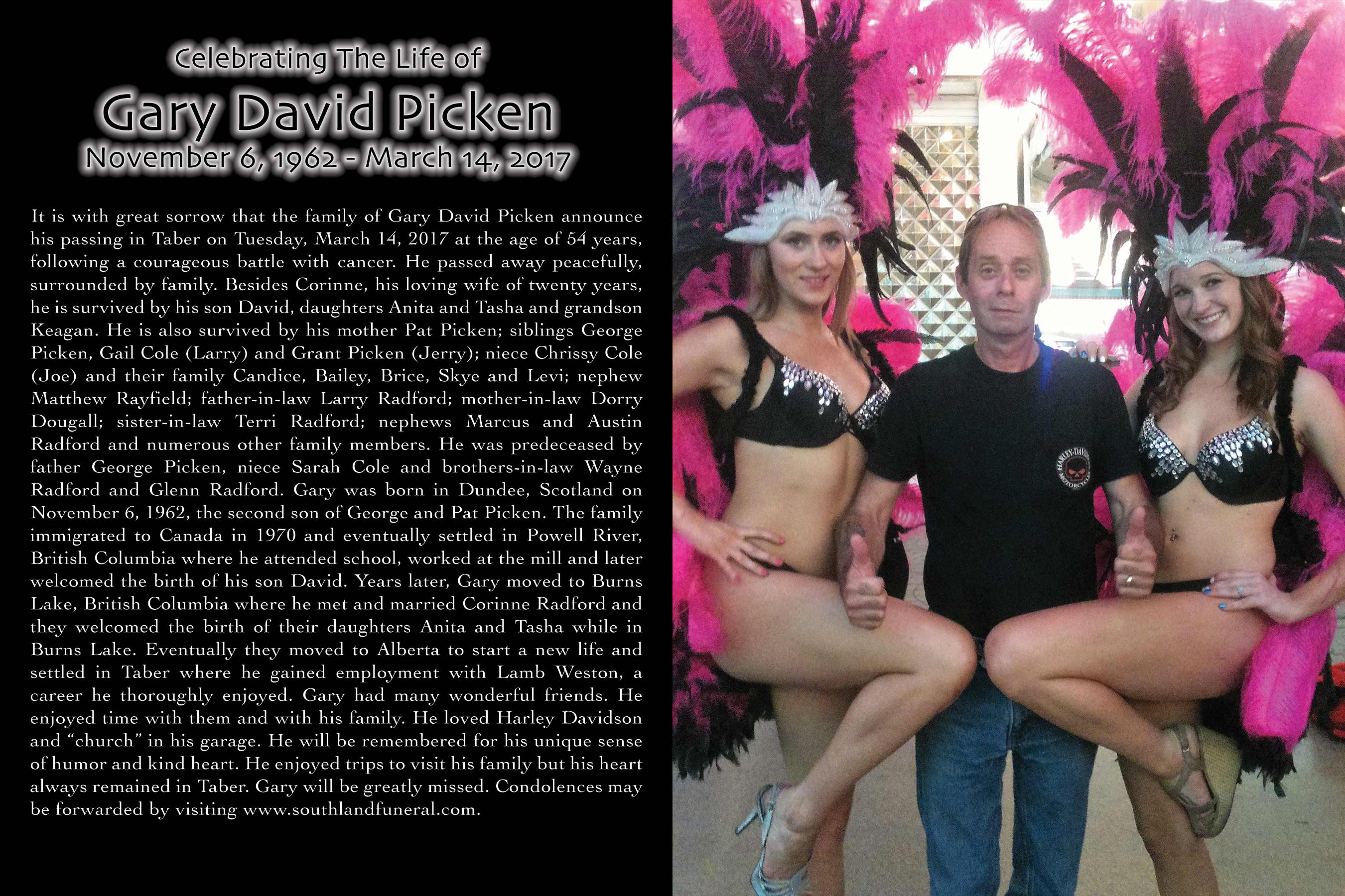 It is with great sorrow that the family of Gary David Picken announce his passing in Taber on Tuesday, March 14, 2017 at the age of 54 years, following a courageous battle with cancer. He passed away peacefully, surrounded by family.
