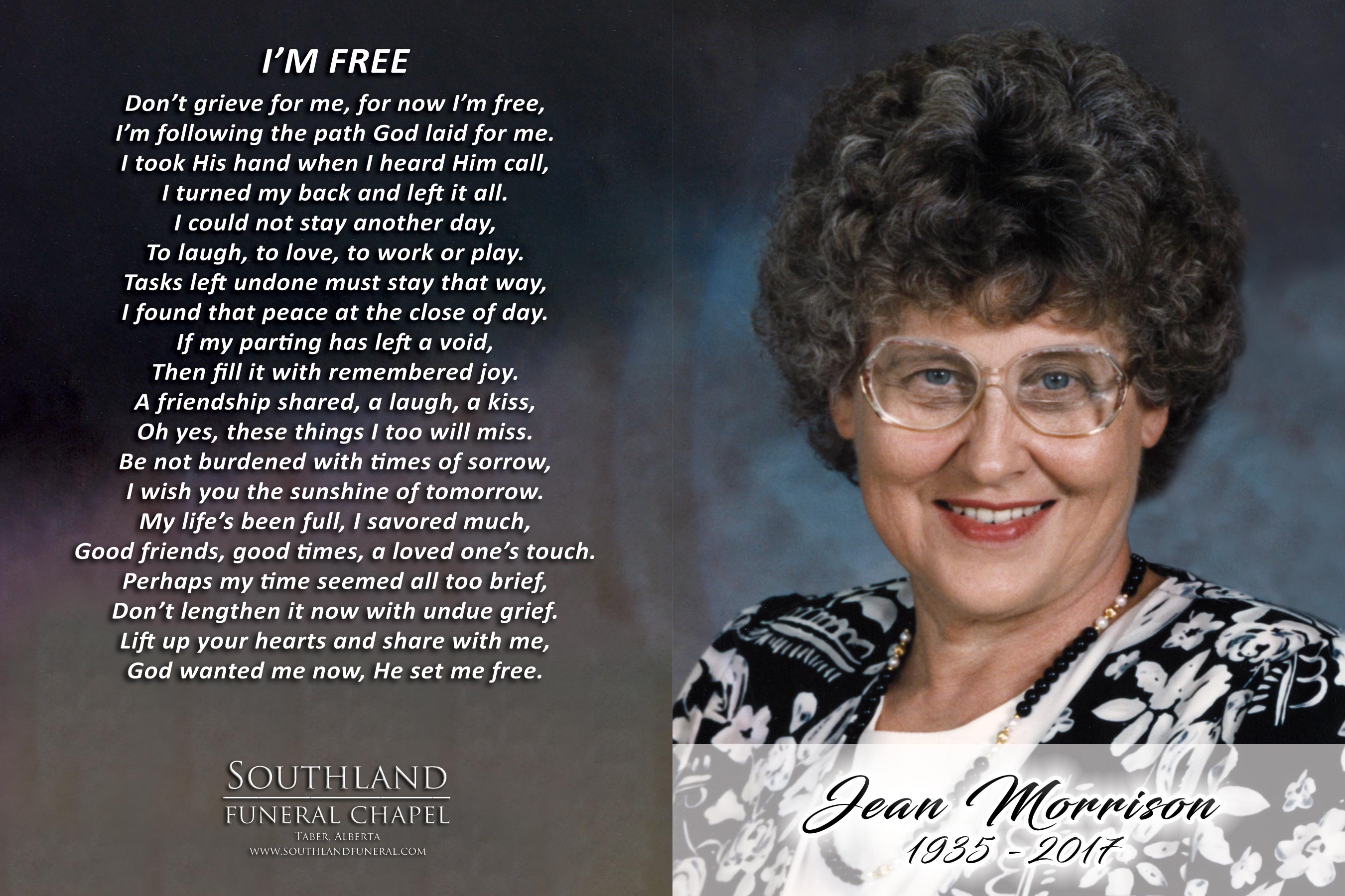 Jeannie Pauline Morrison, beloved wife of the late Donald Morrison, passed away in Taber on Tuesday, March 21, 2017 at the age of 81 years.