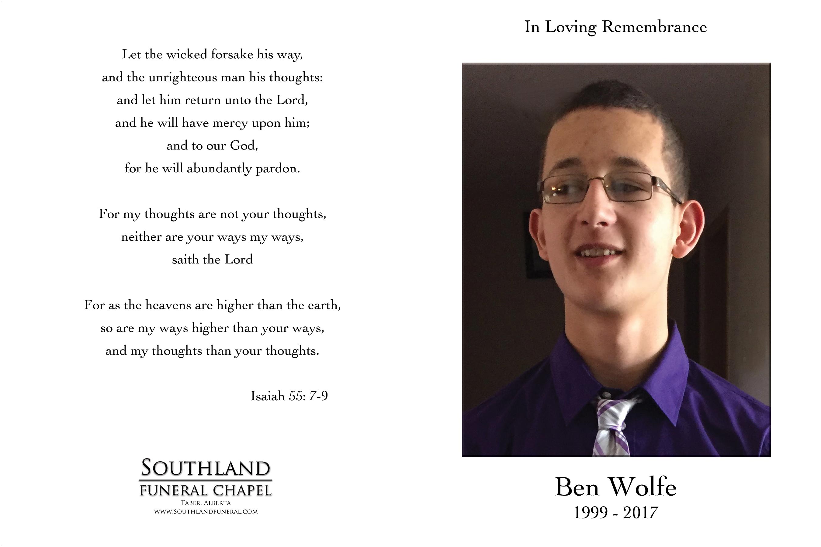 Relatives and friends were invited to meet with the family at Southland Funeral Chapel, 5006 - 48 Avenue, Taber on Sunday, May 7, 2017 between 7:00 P.M. and 9:00 P.M.