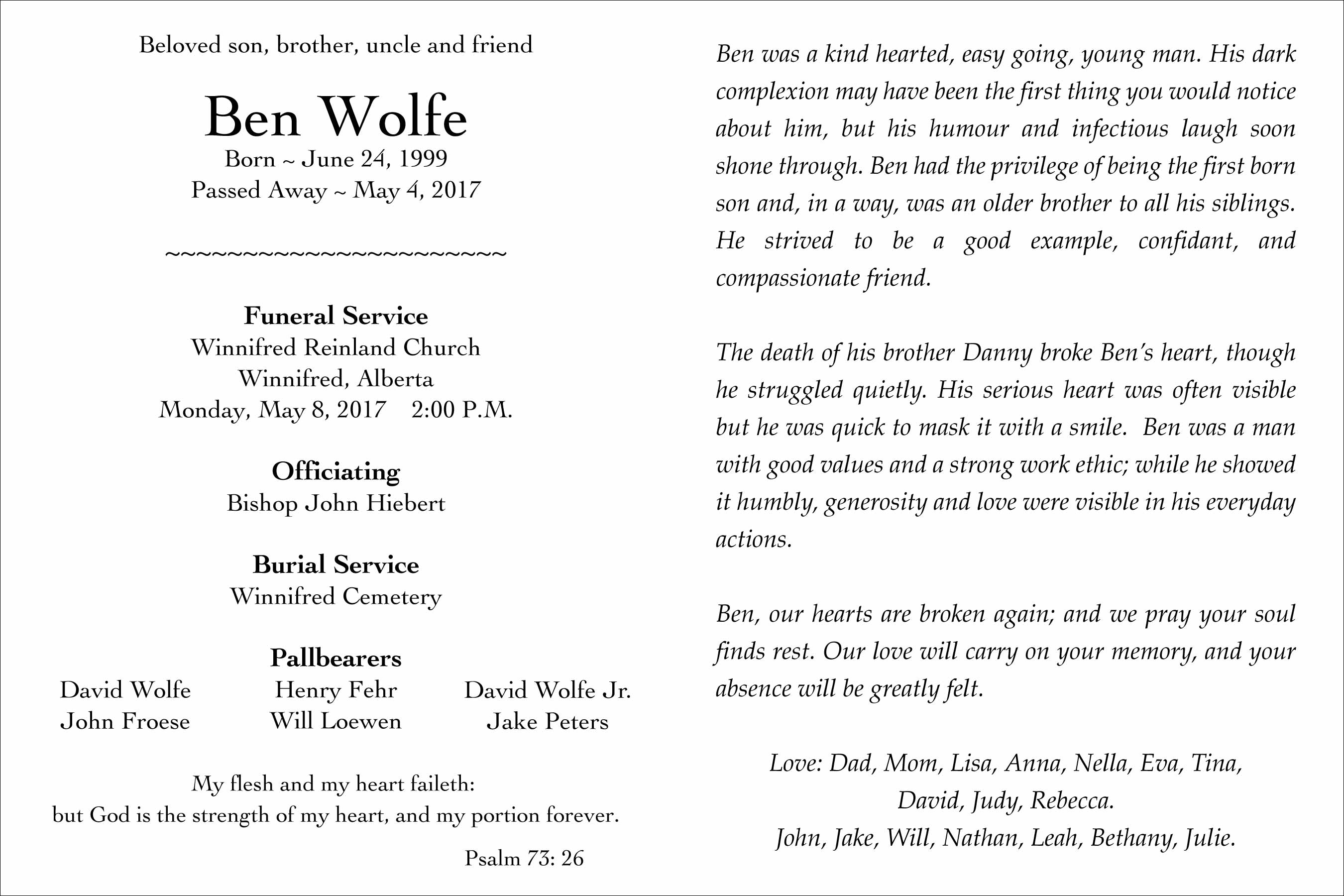 The Funeral Service was held at the Reinland Mennonite Church, Winnifred on Monday, May 8, 2017 at 2:00 P.M. Burial followed at the Winnifred Cemetery.