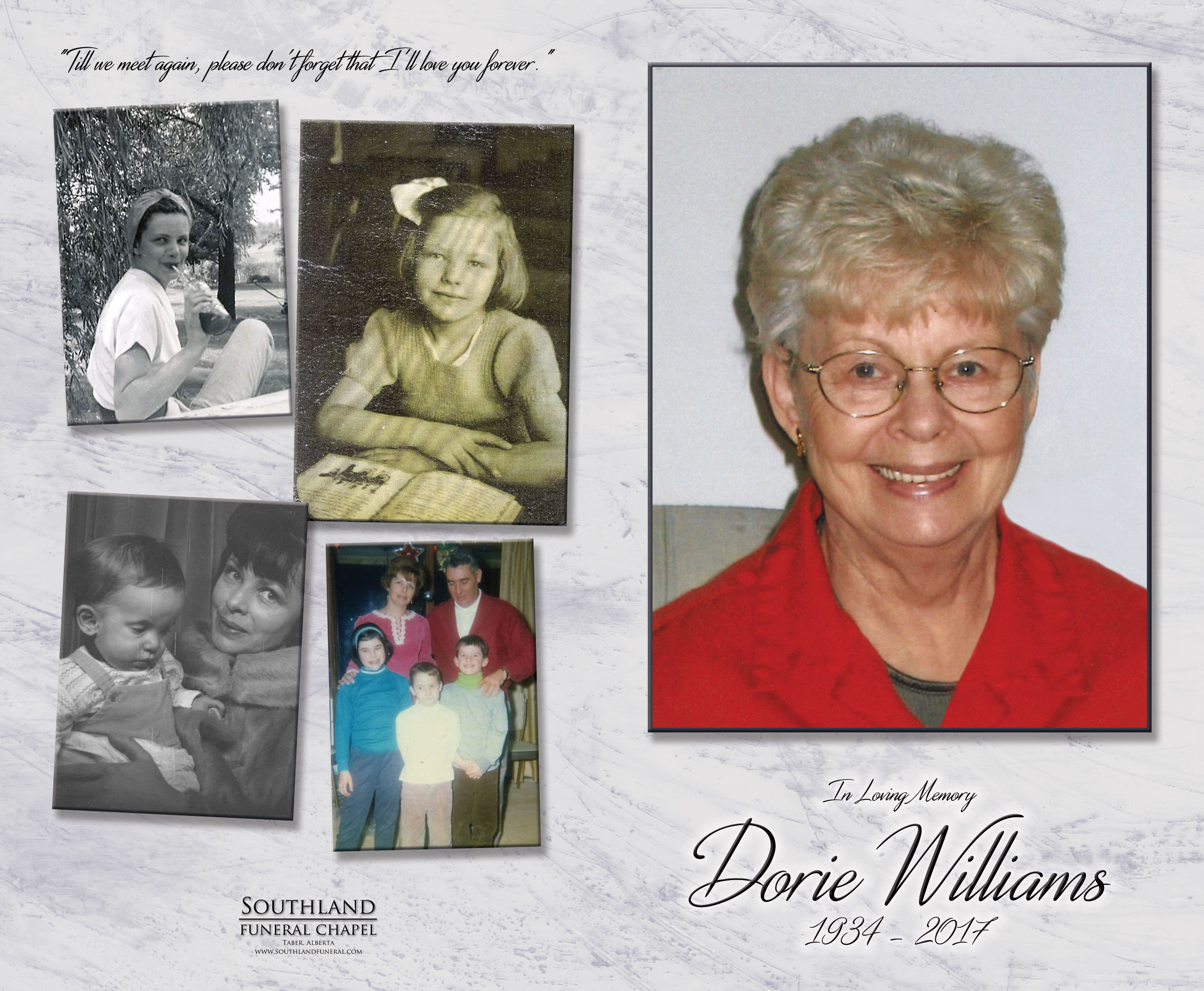 Dorie will be fondly remembered by her four children Vicki (Ray) Gardner of Taber, Paul (Janice) Williams of Lethbridge, Joel Williams of Edmonton and Jon (Barb) Williams of Edmonton. She will hold a special place in the hearts of her ten grandchildren, thirteen great grandchildren, brother Delbert (Marilyn) Linstead as well as numerous other family members and friends.