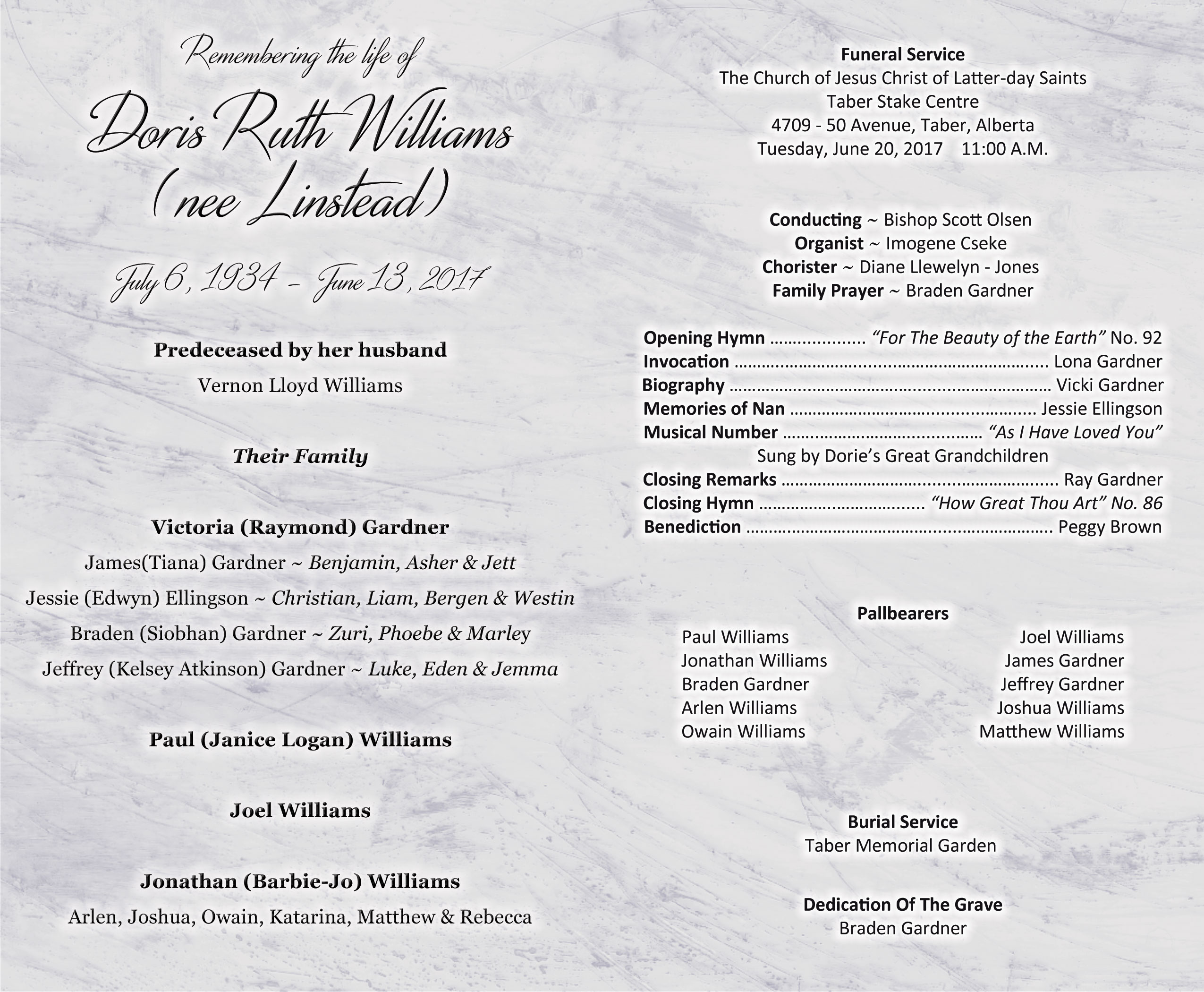 The Funeral Service was held at The Church of Jesus Christ of Latter-day Saints, Taber Stake Centre, 4709 - 50 Avenue, Taber on Tuesday, June 20, 2017 at 11:00 A.M. Burial followed at the Taber Memorial Garden.