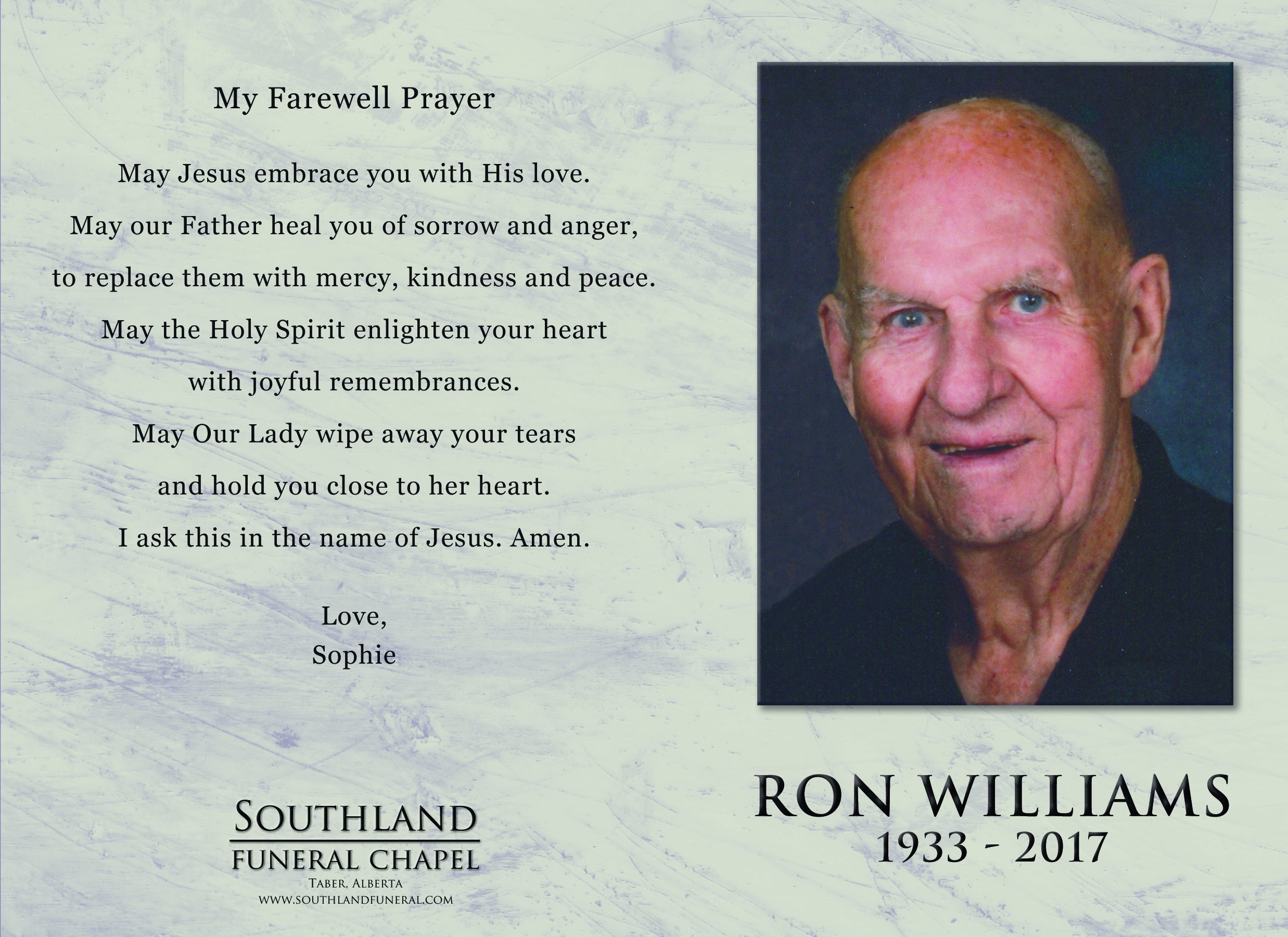 Relatives and friends were invited to Prayers at Southland Funeral Chapel, 5006 - 48 Avenue, Taber on Thursday, July 6, 2017 at 7:00 P.M.