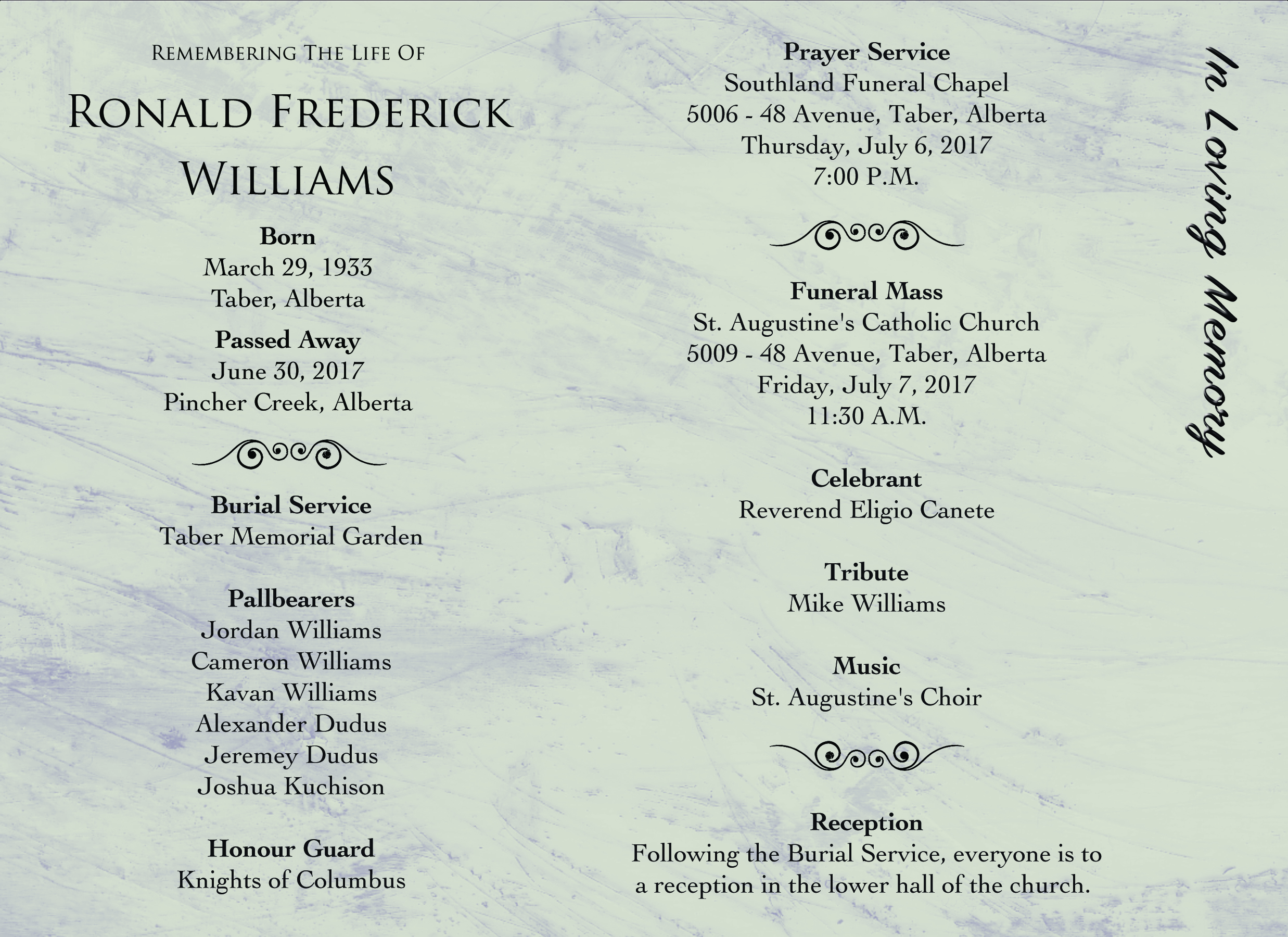 The Funeral Mass was celebrated at St. Augustine's Catholic Church, 5009 - 48 Avenue, Taber on Friday, July 7, 2017 at 11:30 A.M. Burial followed at the Taber Memorial Garden.