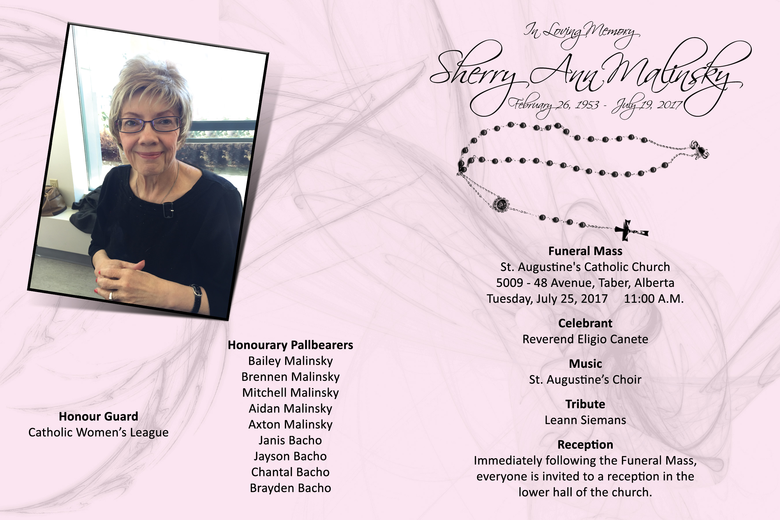 The Funeral Mass was celebrated at St. Augustine's Catholic Church, 5009 - 48 Avenue, Taber on Tuesday, July 25, 2017 at 11:00 A.M.