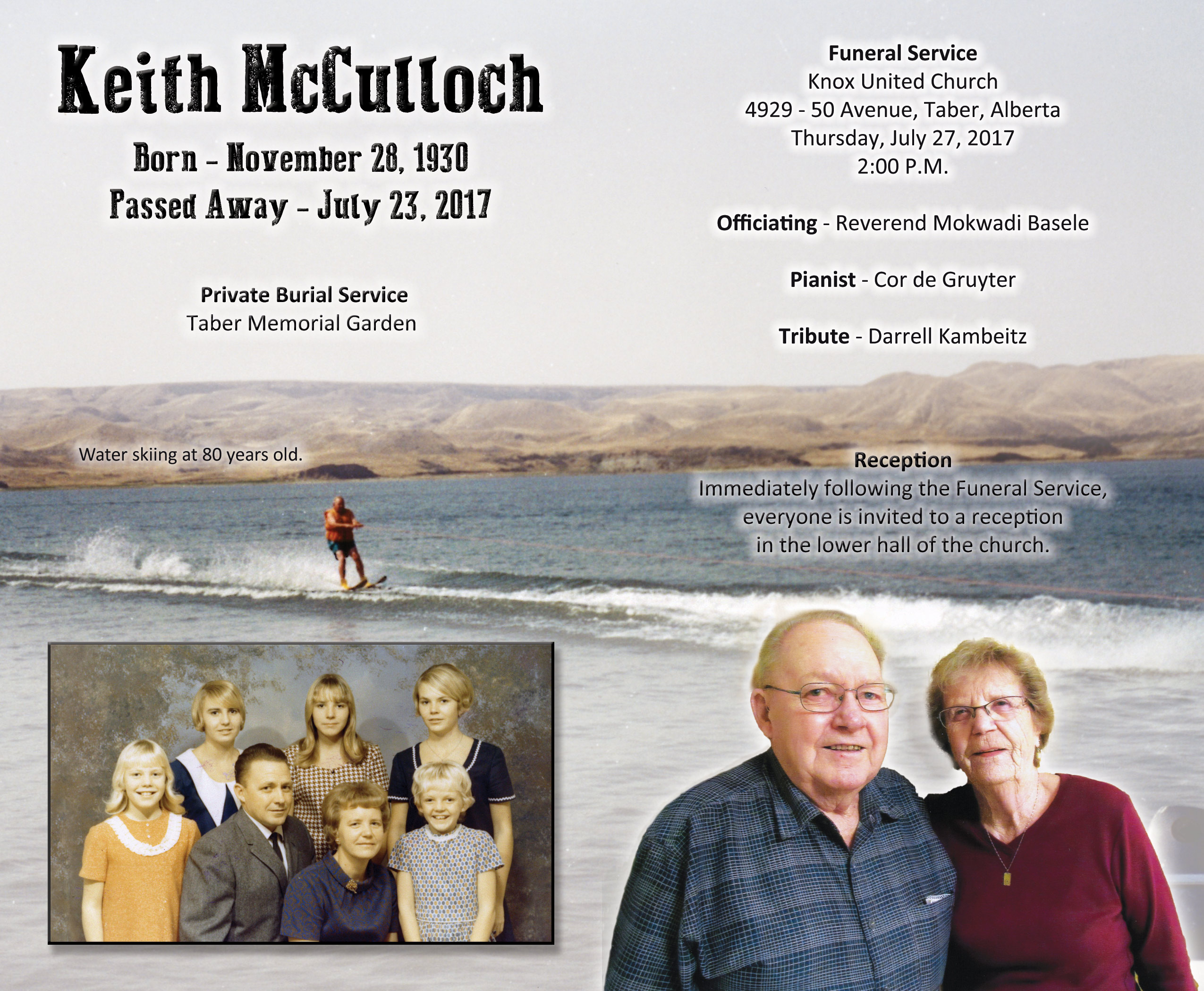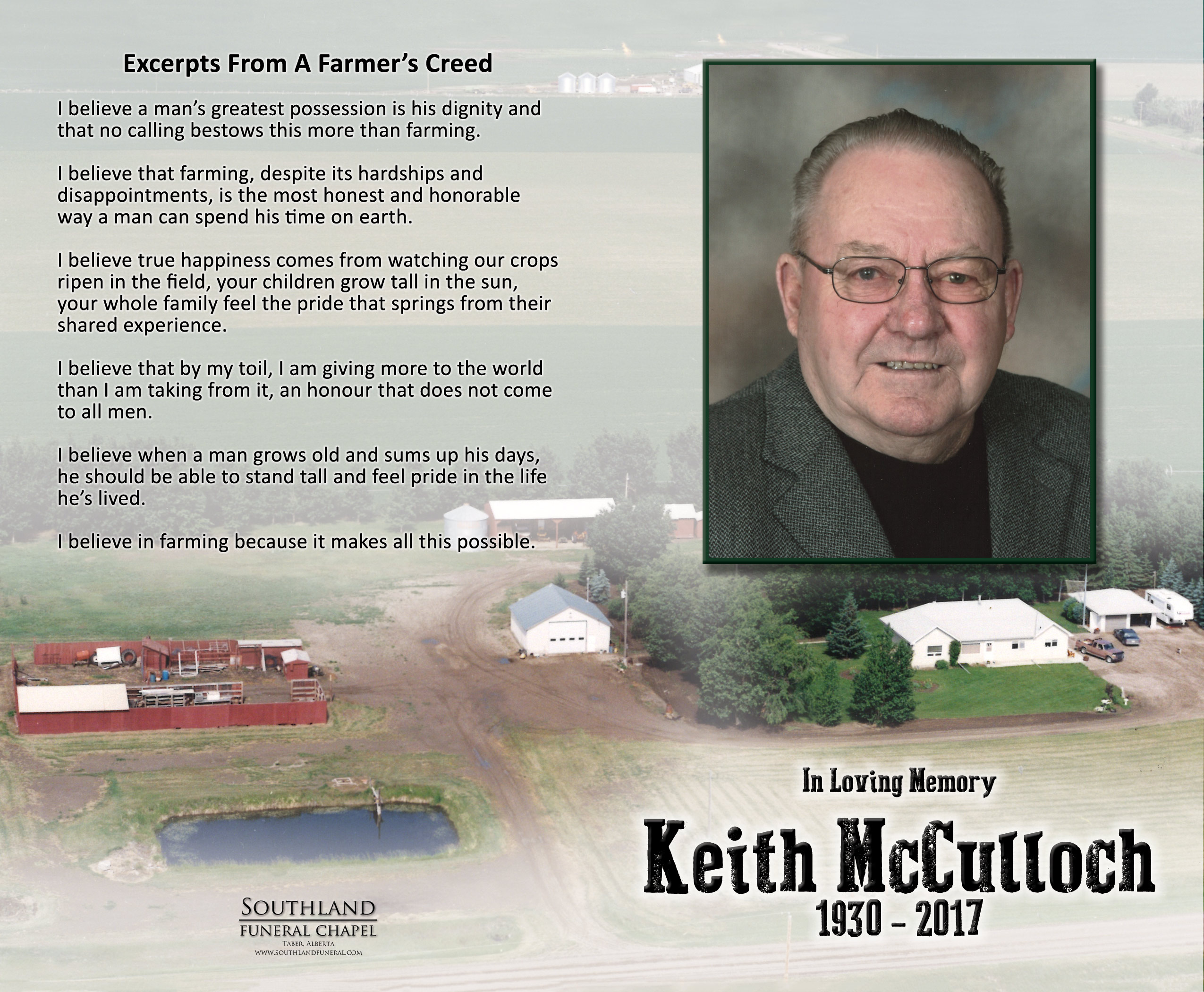 Keith McCulloch, beloved husband of Verna McCulloch, passed away in Taber on Sunday, July 23, 2017 at the age of 86 years.