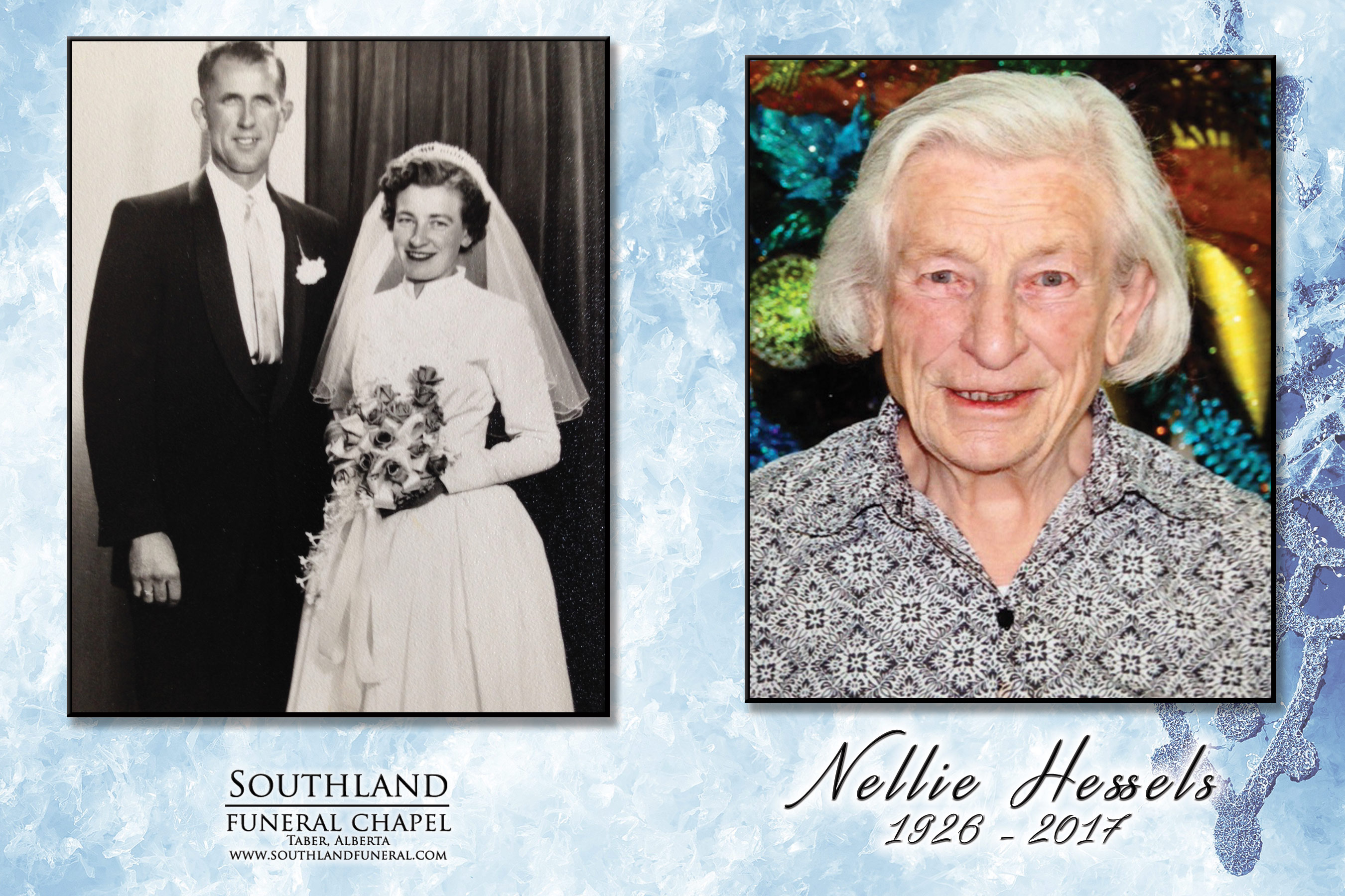 Nellie is survived by her son Adrian (Bev) Hessels of Calgary; daughters Josie Hessels of Victoria, British Columbia and Liz Friesen of Markham, Ontario; six grandchildren as well as numerous siblings, nieces and nephews in the Netherlands.