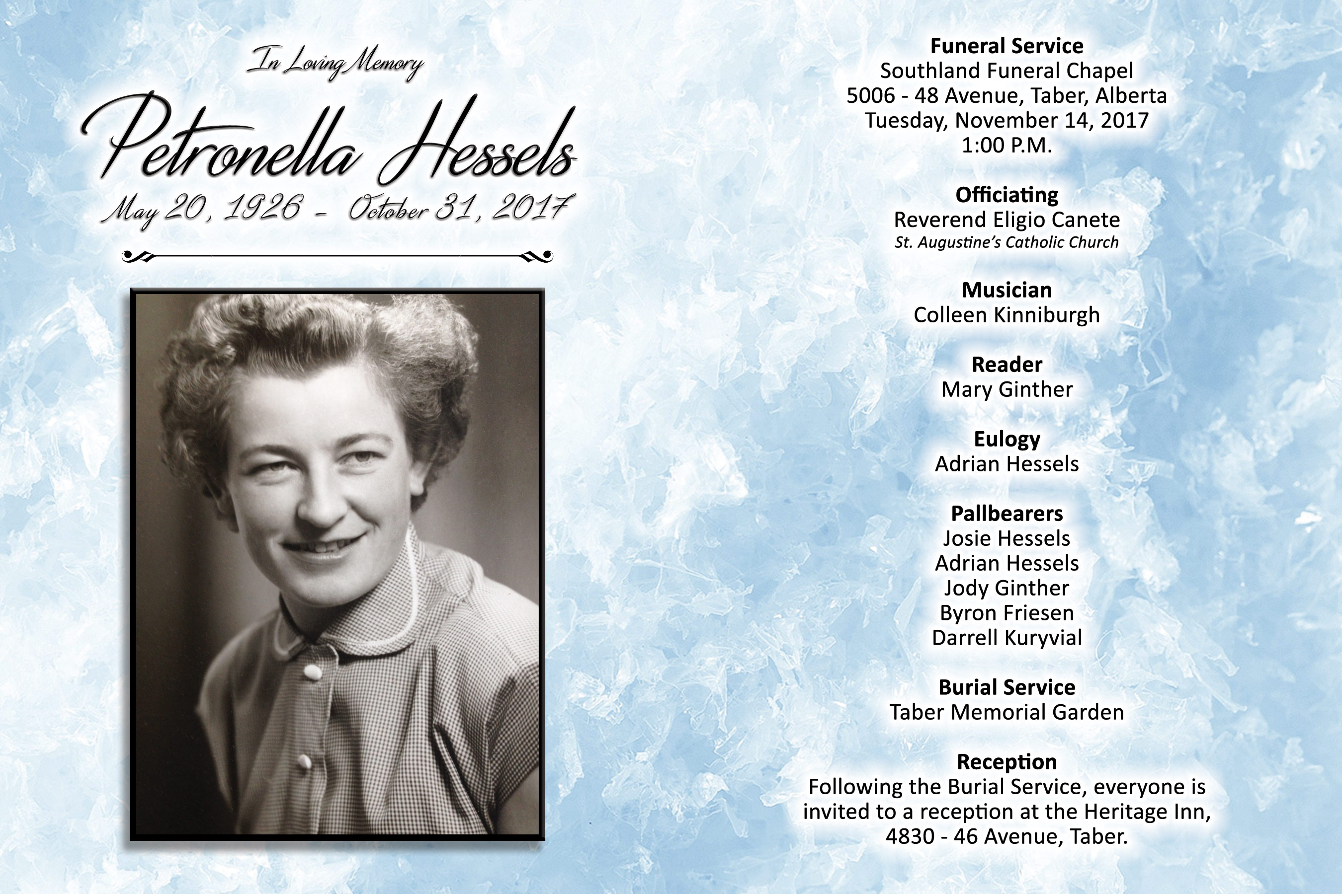 The Funeral Service was held at Southland Funeral Chapel, 5006 - 48 Avenue, Taber on Tuesday, November 14, 2017 at 1:00 P.M. Burial followed at the Taber Memorial Garden.