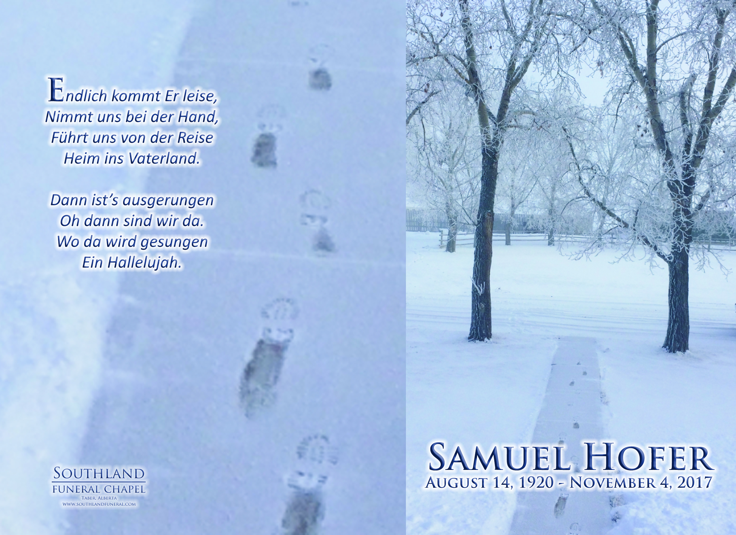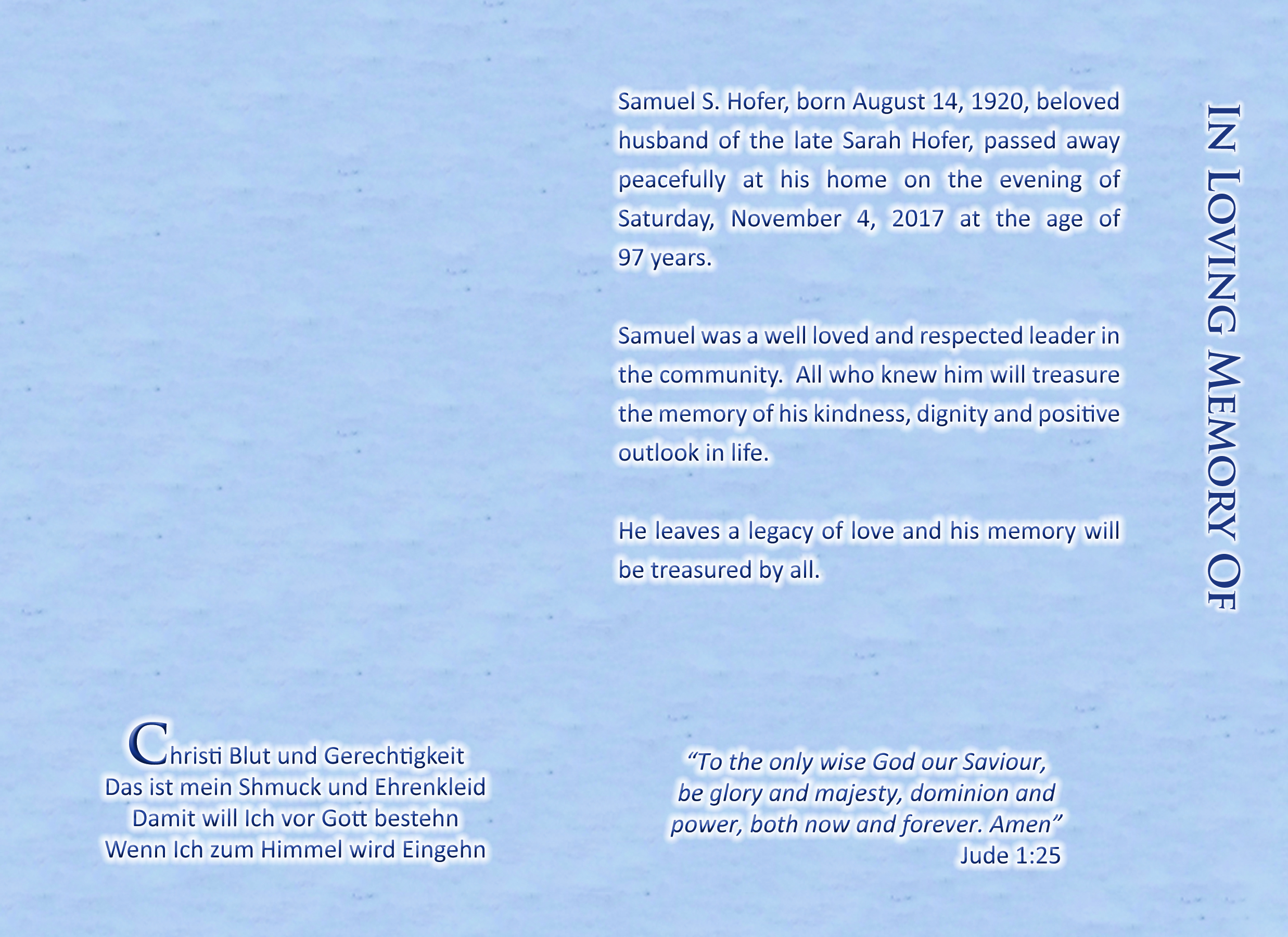 Samuel S. Hofer, born August 14, 1920, beloved husband of the late Sarah Hofer, passed away peacefully at his home on the evening of Saturday, November 4, 2017 at the age of 97 years.