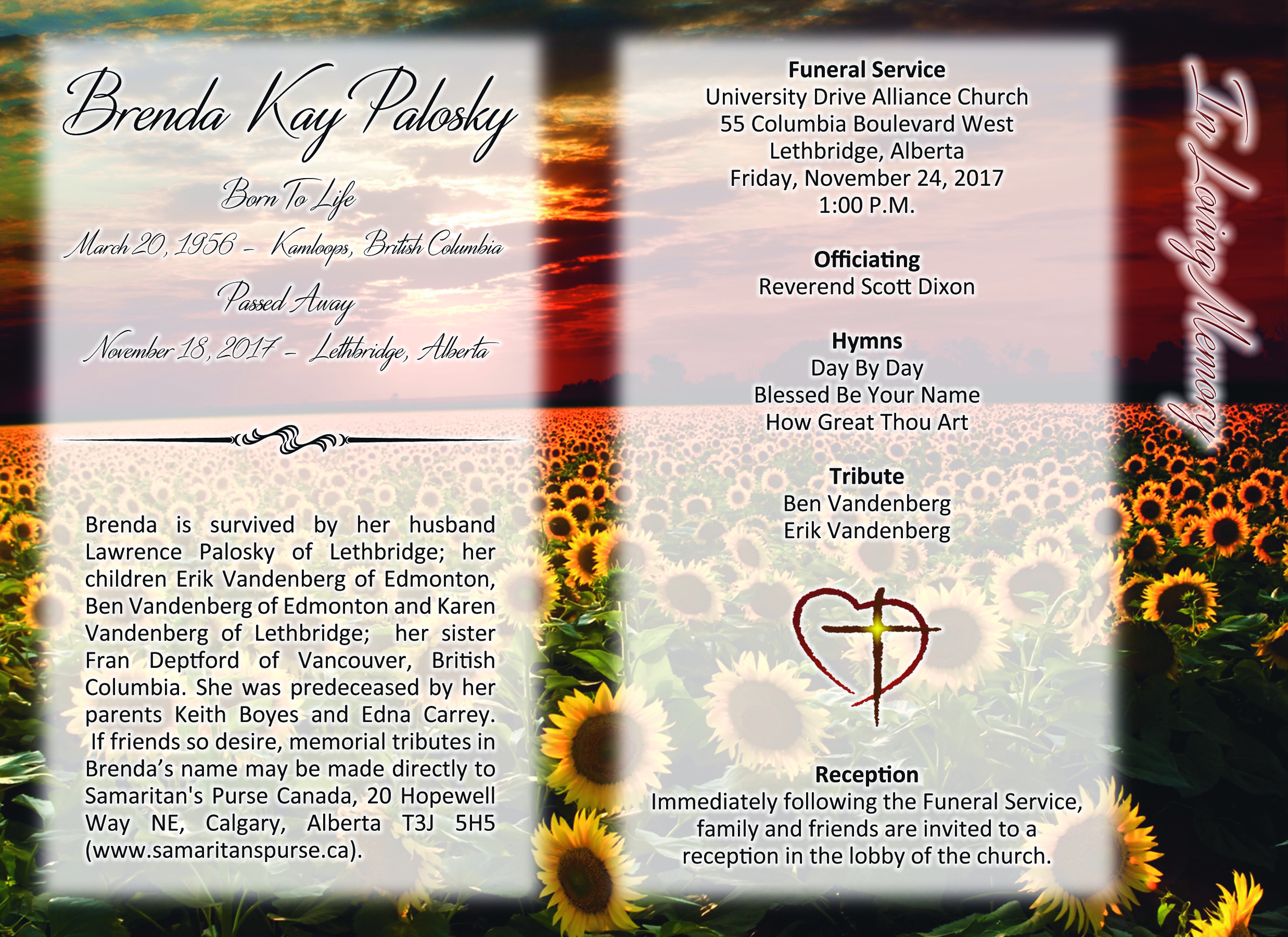 The Funeral Service was held at the University Drive Alliance Church, 55 Columbia Boulevard West, Lethbridge on Friday, November 24, 2017 at 1:00 P.M.