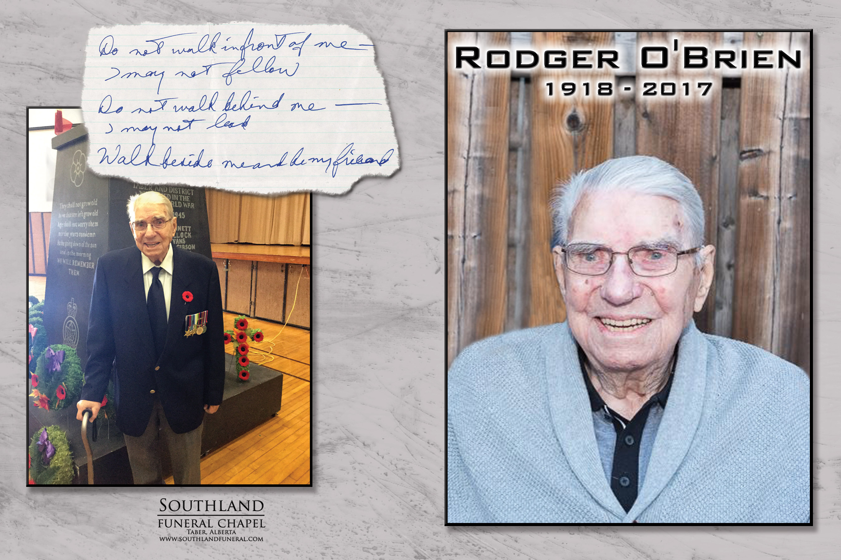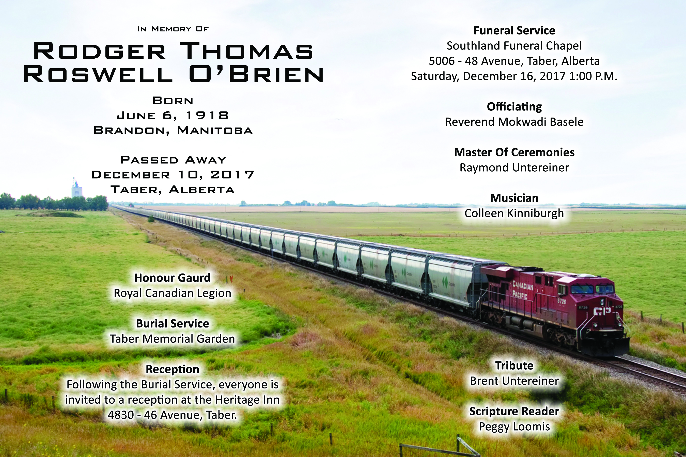 Rodger Thomas Roswell O’Brien, beloved husband of the late Norma O’Brien, passed away peacefully in Taber on Sunday, December 10, 2017 at the age of 99 years.