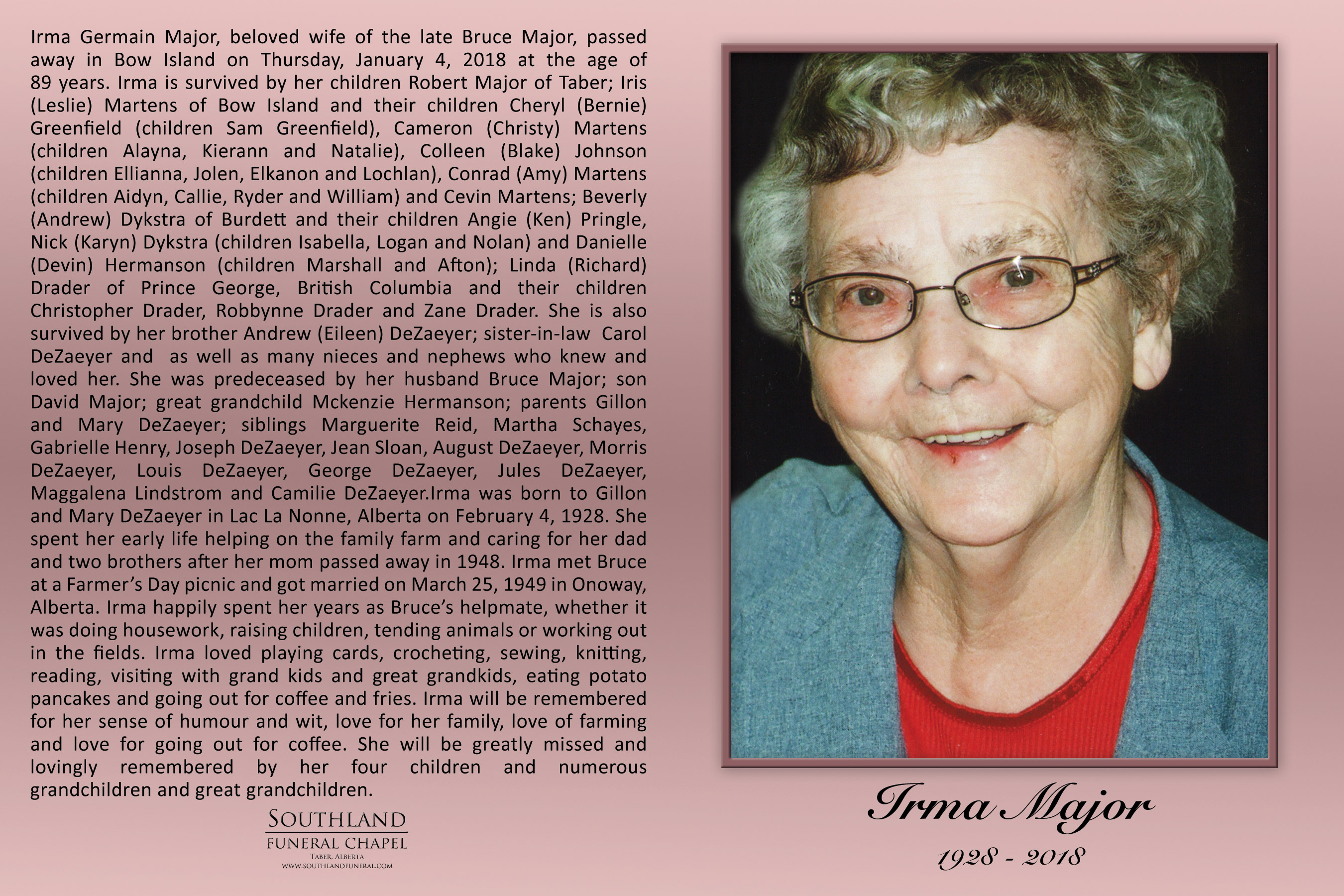 Irma is survived by her children Robert Major of Taber; Iris (Leslie) Martens of Bow Island and their children Cheryl (Bernie) Greenfield (children Sam Greenfield), Cameron (Christy) Martens (children Alayna, Kierann and Natalie), Colleen (Blake) Johnson (children Ellianna, Jolen, Elkanon and Lochlan), Conrad (Amy) Martens (children Aidyn, Callie, Ryder and William) and Cevin Martens; Beverly (Andrew) Dykstra of Burdett and their children Angie (Ken) Pringle, Nick (Karyn) Dykstra (children Isabella, Logan and Nolan) and Danielle (Devin) Hermanson (children Marshall and Afton); Linda (Richard) Drader of Prince George, British Columbia and their children Christopher Drader, Robbynne Drader and Zane Drader. She is also survived by her brother Andrew (Eileen) DeZaeyer; sister-in-law Carol DeZaeyer and as well as many nieces and nephews who knew and loved her.