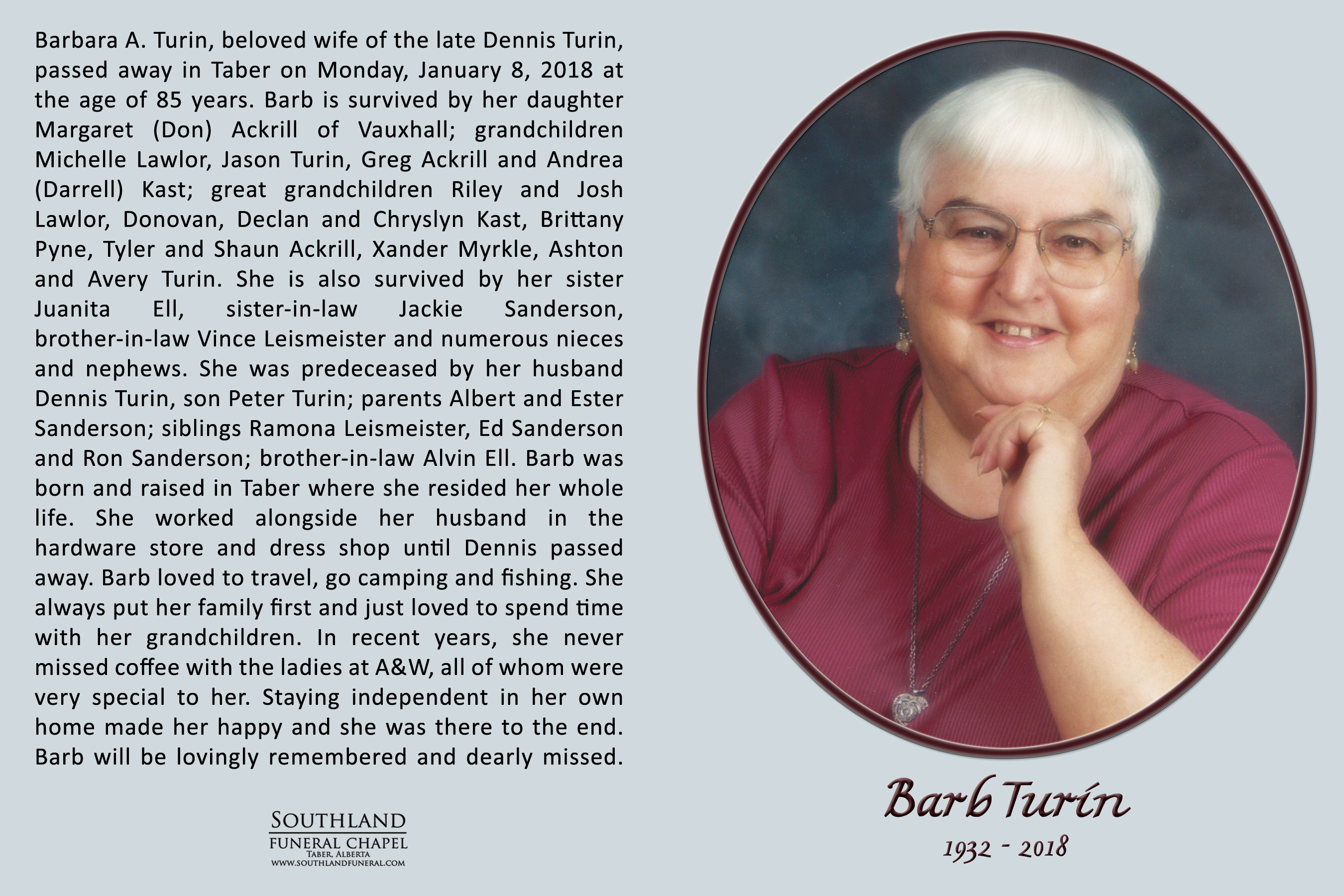 Barbara A. Turin, beloved wife of the late Dennis Turin, passed away in Taber on Monday, January 8, 2018 at the age of 85 years.