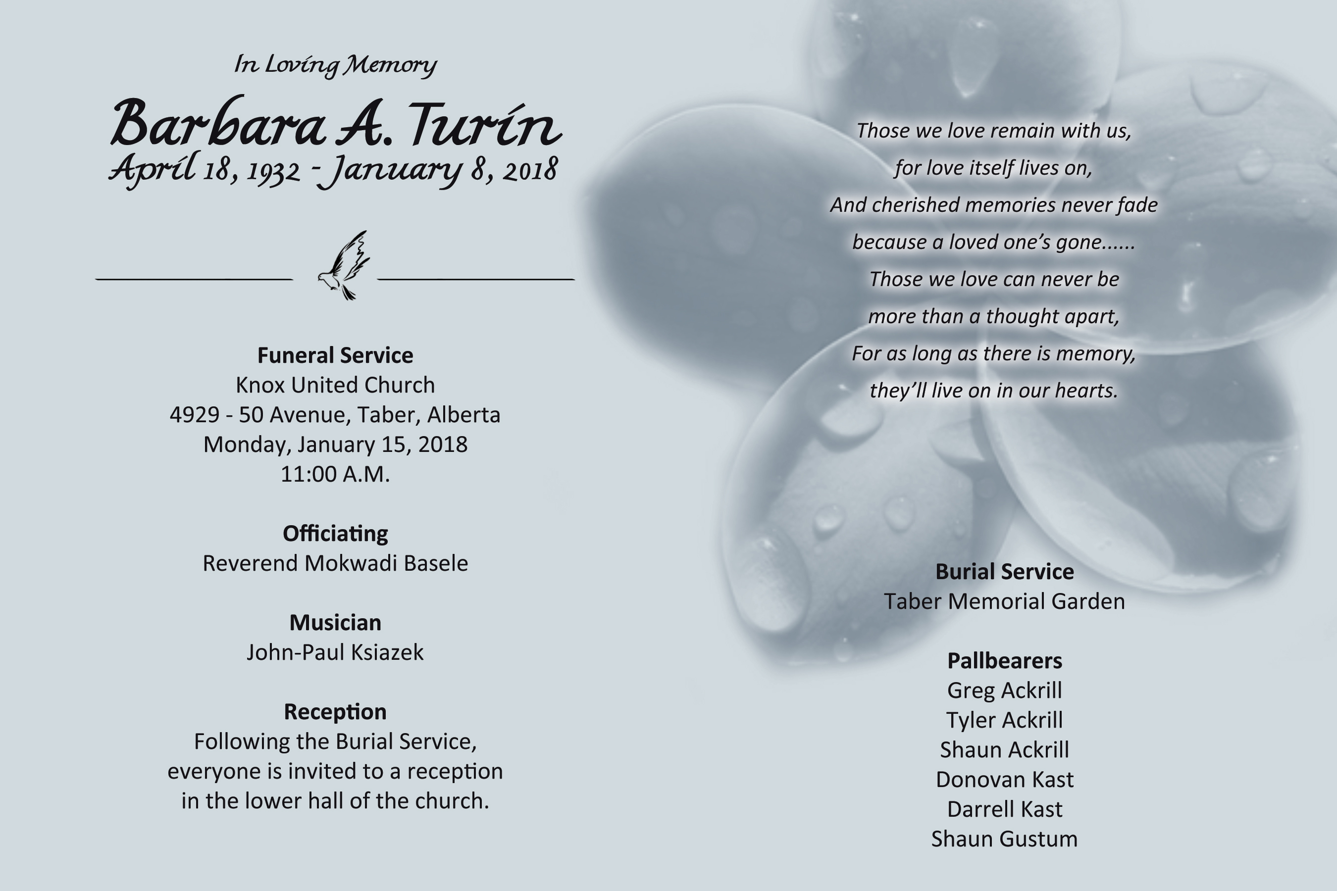 The Funeral Service was held at Knox United Church, 4929 - 50 Avenue, Taber on Monday, January 15, 2018 at 11:00 A.M. Burial followed at the Taber Memorial Garden.