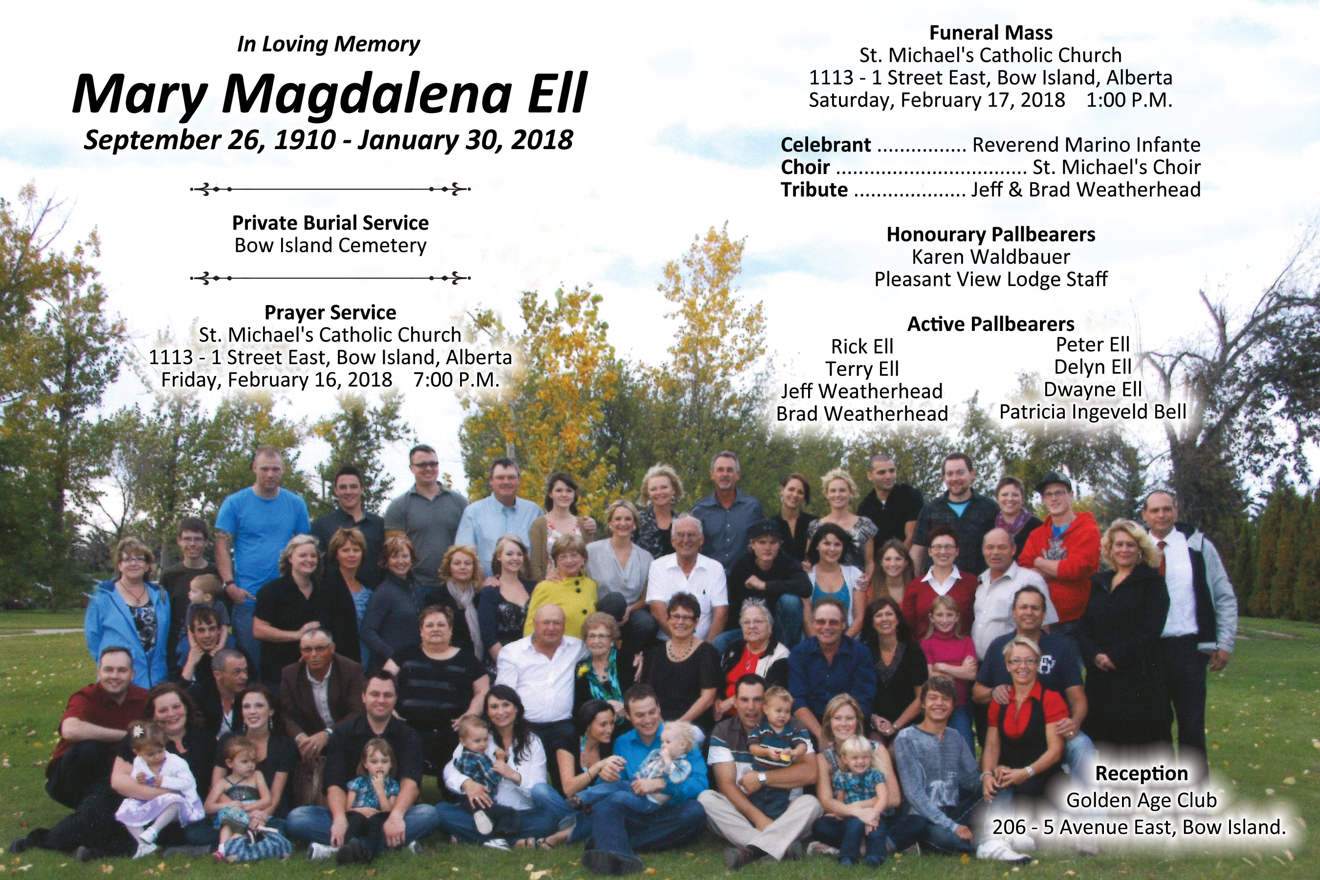 Mary is survived by her son Raymond (Theresa) Ell of Australia, daughter Marilyn (Earl) Weatherhead of Burdett and daughter-in-law Juanita Ell of High River. She is also survived by sixteen grandchildren, thirty four great grandchildren and eleven great great grandchildren; sister Martha O’Brien (105 years) as well as many nieces and nephews.