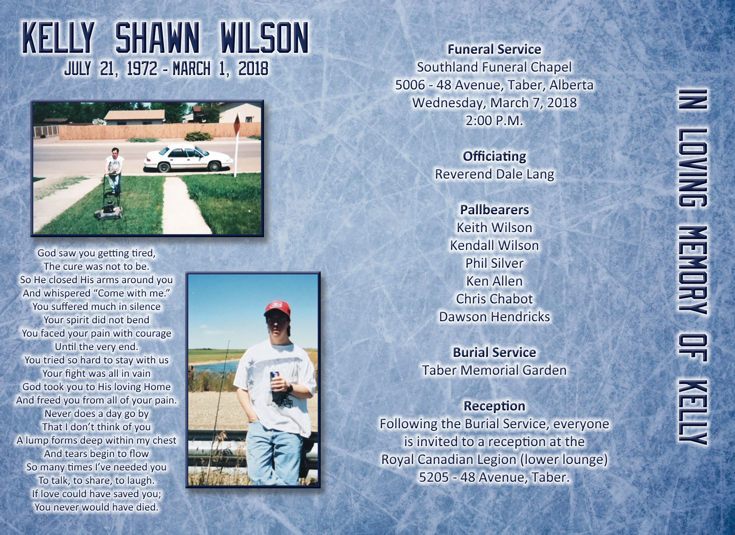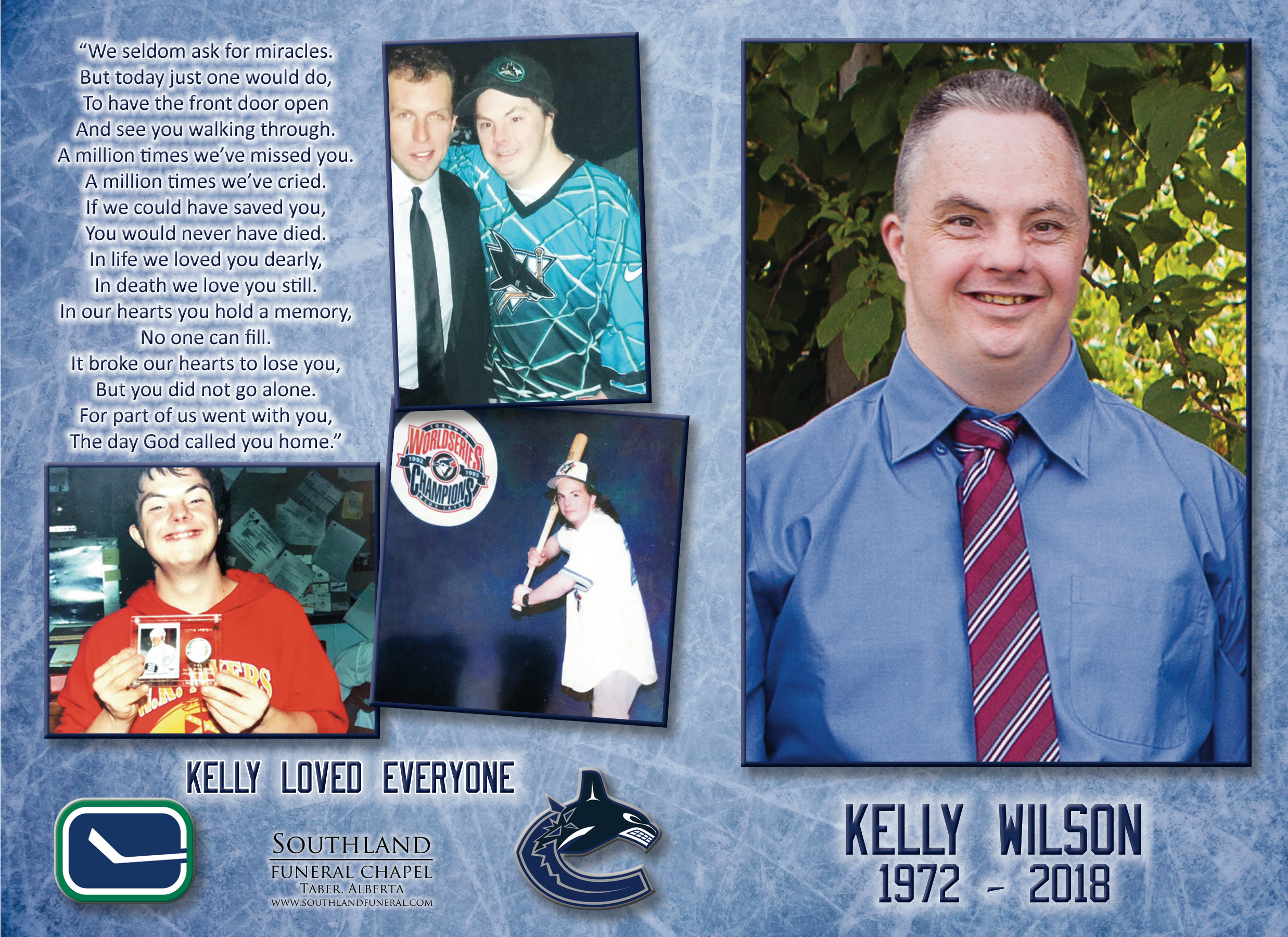 Kelly was the eldest son of David and Linda Wilson, born in Taber on July 21, 1972. He was a bright light in the lives of all who knew him with a happy spirit and a ready smile. Kelly had a passion for sports, especially hockey, with the Vancouver Canucks as his favorite team. He could often be found writing down stats and sitting on the edge of his seat cheering on his teams.