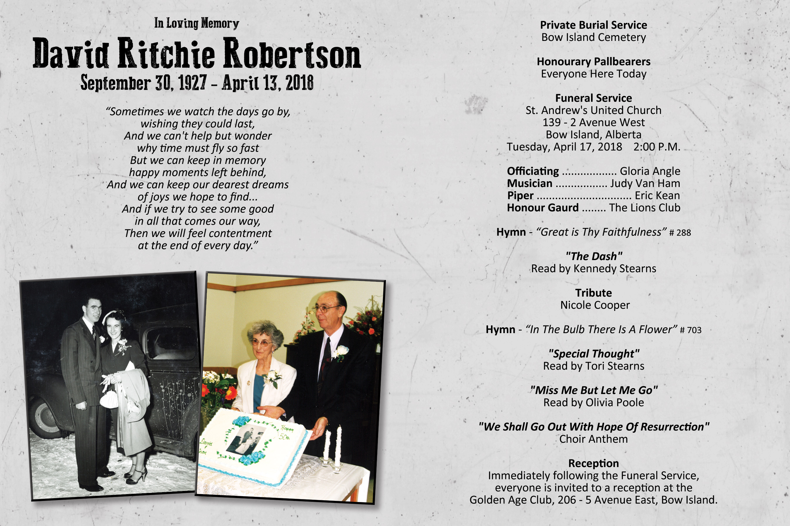 David Ritchie Robertson, beloved husband of Elinor Robertson (nee Rowley), passed away in Bow Island on the evening of Friday, April 13, 2018 at the age of 90 years.
