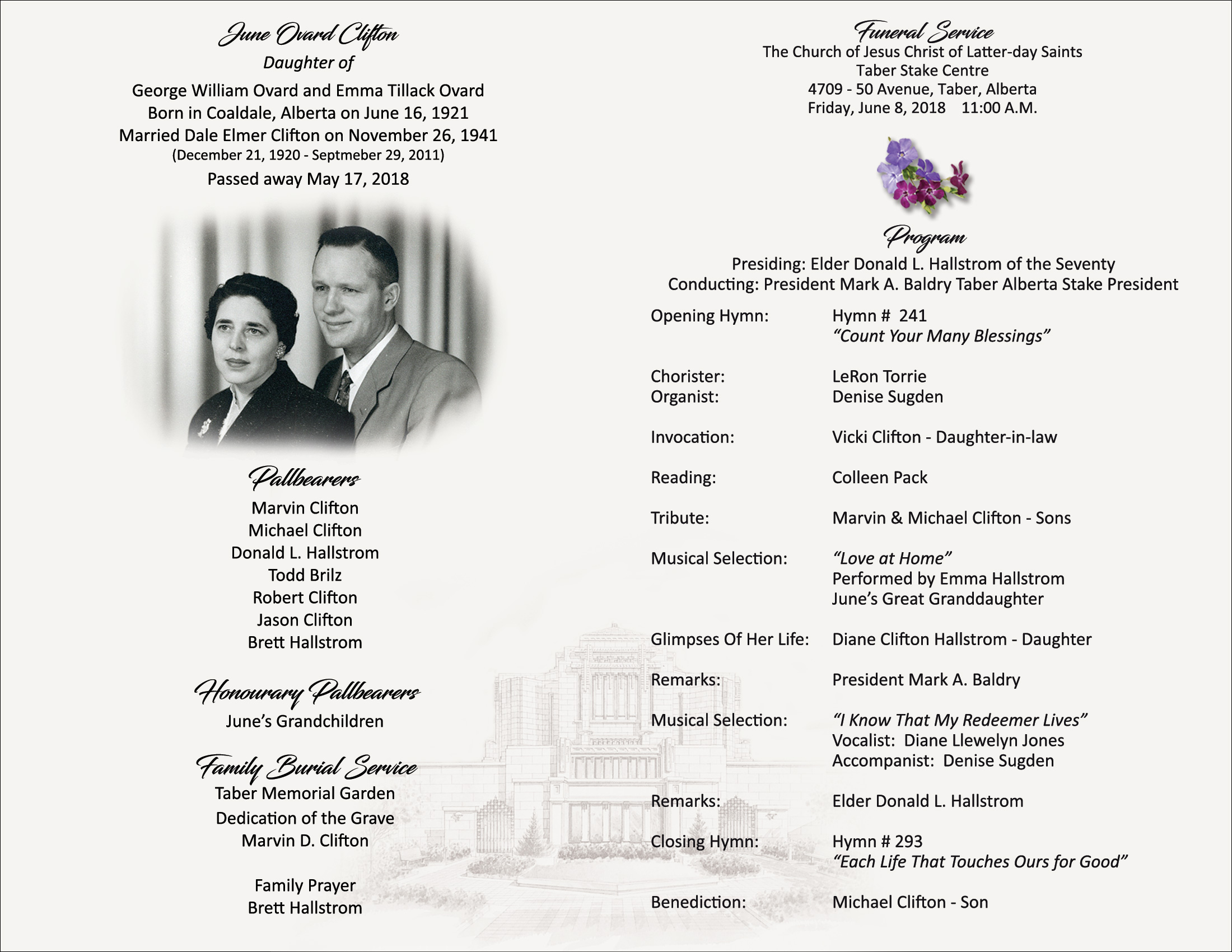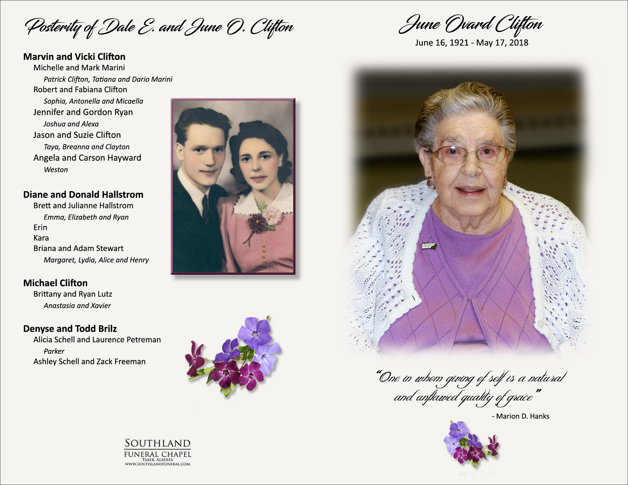She was predeceased by her husband Dale, her parents and all her siblings. June was born on June 16, 1921 in Coaldale to her parents Emma (nee Tillack) and George Ovard. She was their seventh daughter and ninth child. June married her childhood sweetheart Dale Clifton on November 26, 1941 in the Cardston Alberta Temple. They were married for sixty nine years.