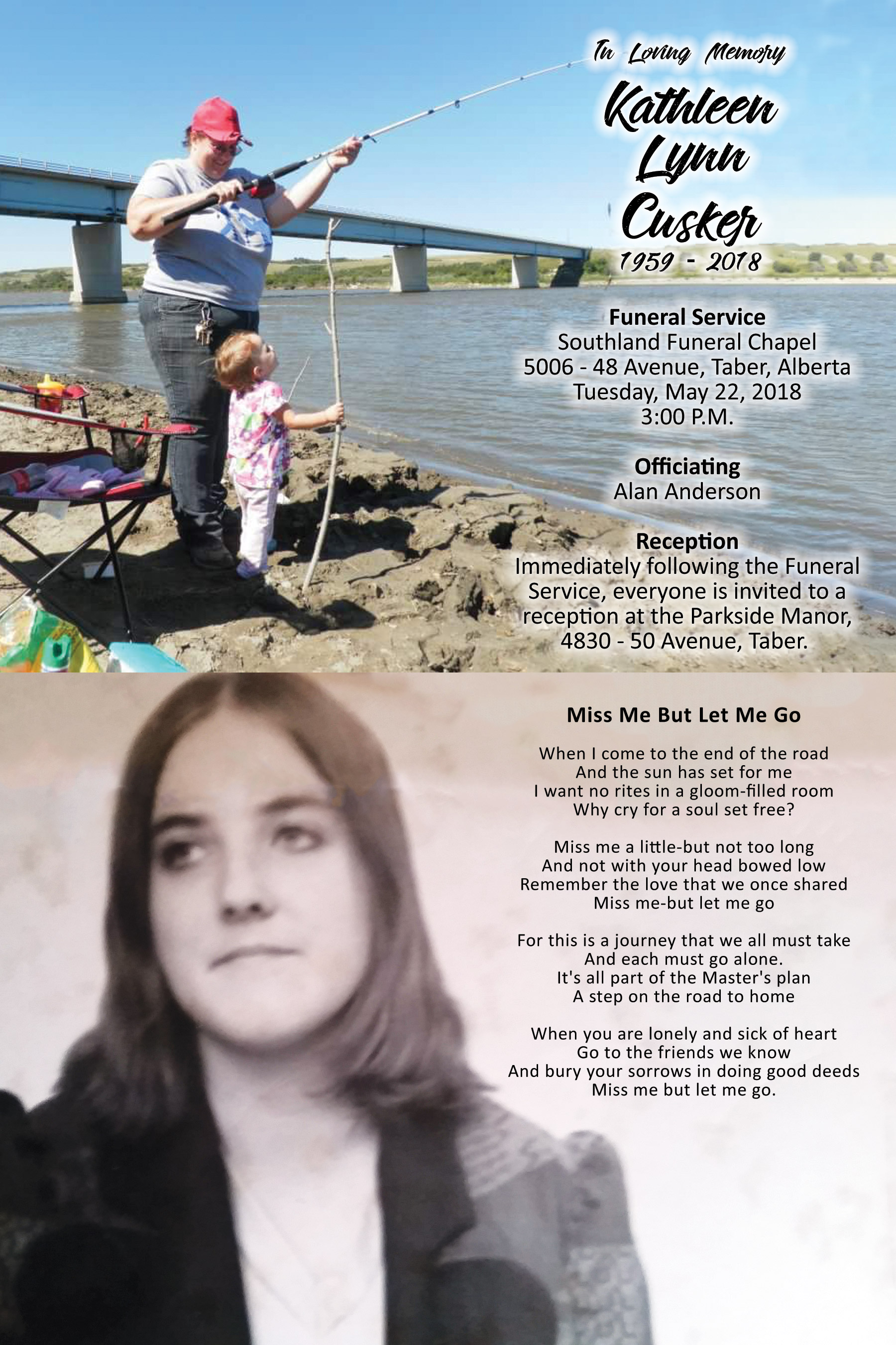 Kathleen Cusker, passed away in Taber on Friday, May 18, 2018 at the age of 58 years.
