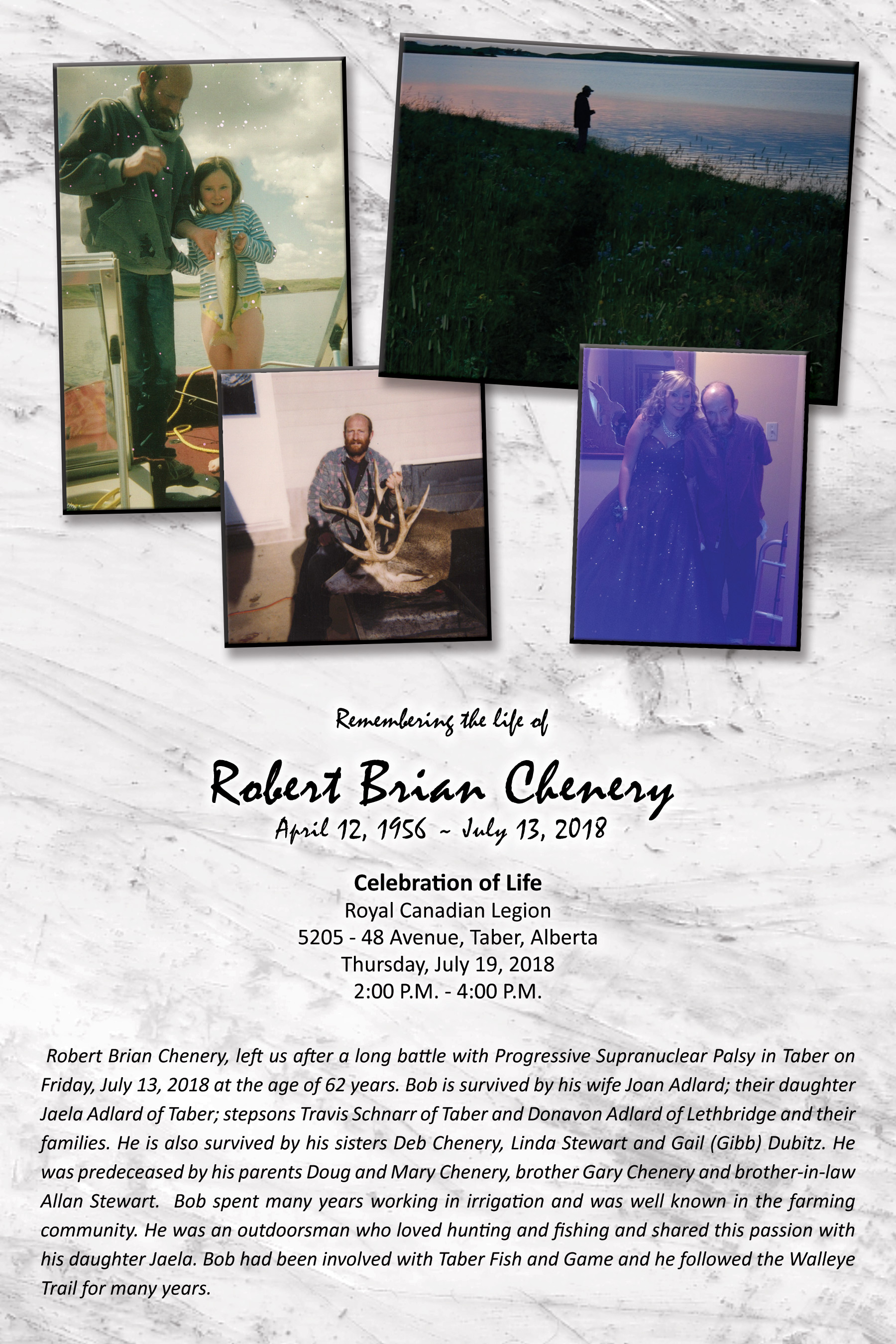 Robert Brian Chenery, left us after a long battle with Progressive Supranuclear Palsy in Taber on Friday, July 13, 2018 at the age of 62 years.