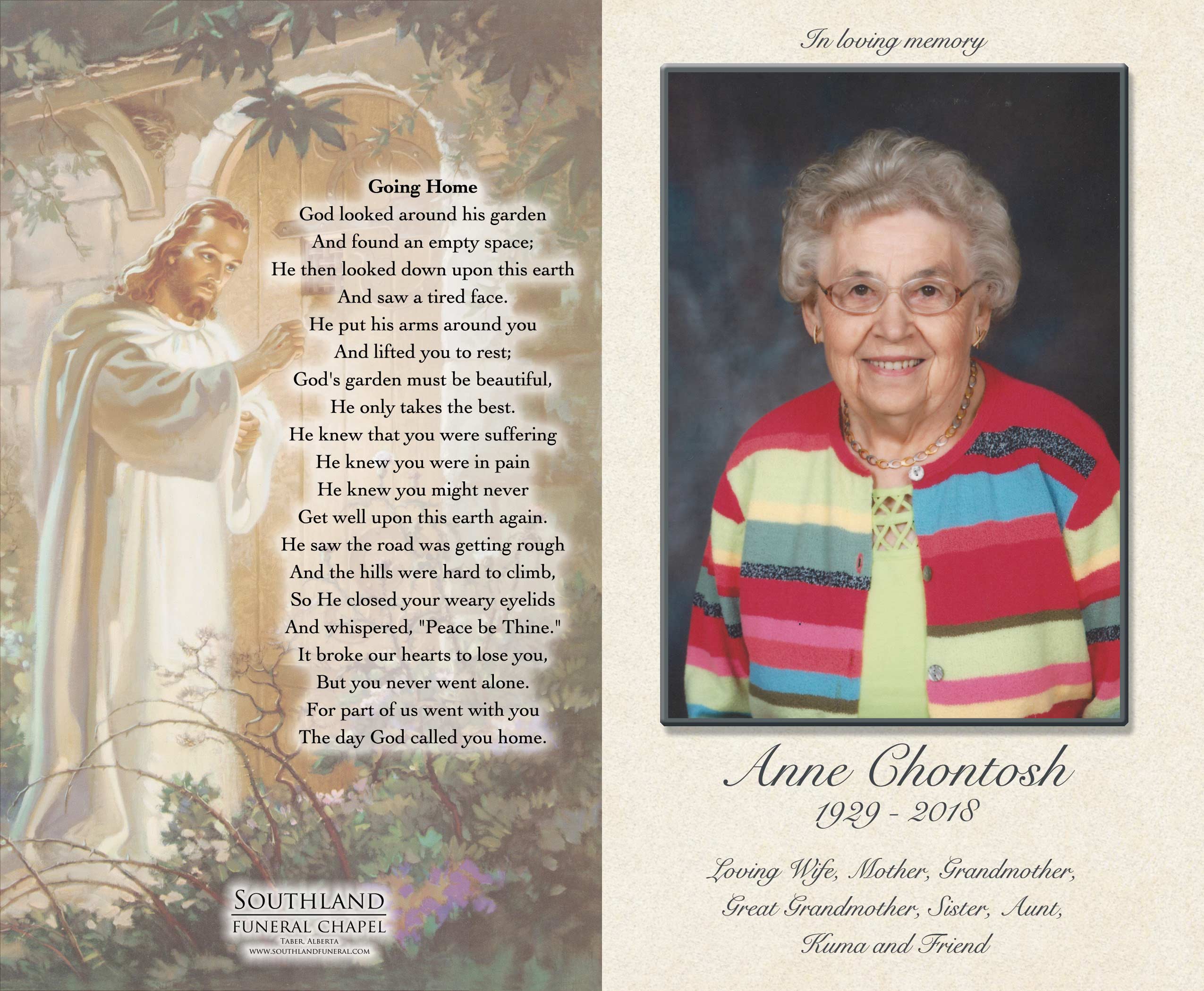 Anne was born at Raymond on February 16, 1929 to Mike and Katie Boras. She went to school in Iron Springs and then worked in Picture Butte. She married Andy Chontosh on January 31, 1950 in Picture Butte. In 1951 they purchased a farm in Taber, where the family resides today. Anne's greatest love was her family, as well she loved cooking, baking, and gardening. She loved to entertain and hosted several birthday and anniversary parties. Anne enjoyed several crafts such as crochet, quilting, bunka and braiding rugs. She had a love for sports, especially baseball and her favorite team the Blue Jays, as well as hockey and the Calgary Flames. Anne was a member of the Catholic Woman's League, joining as a young girl in Picture Butte and continued after her marriage in Taber (for over sixty eight years).