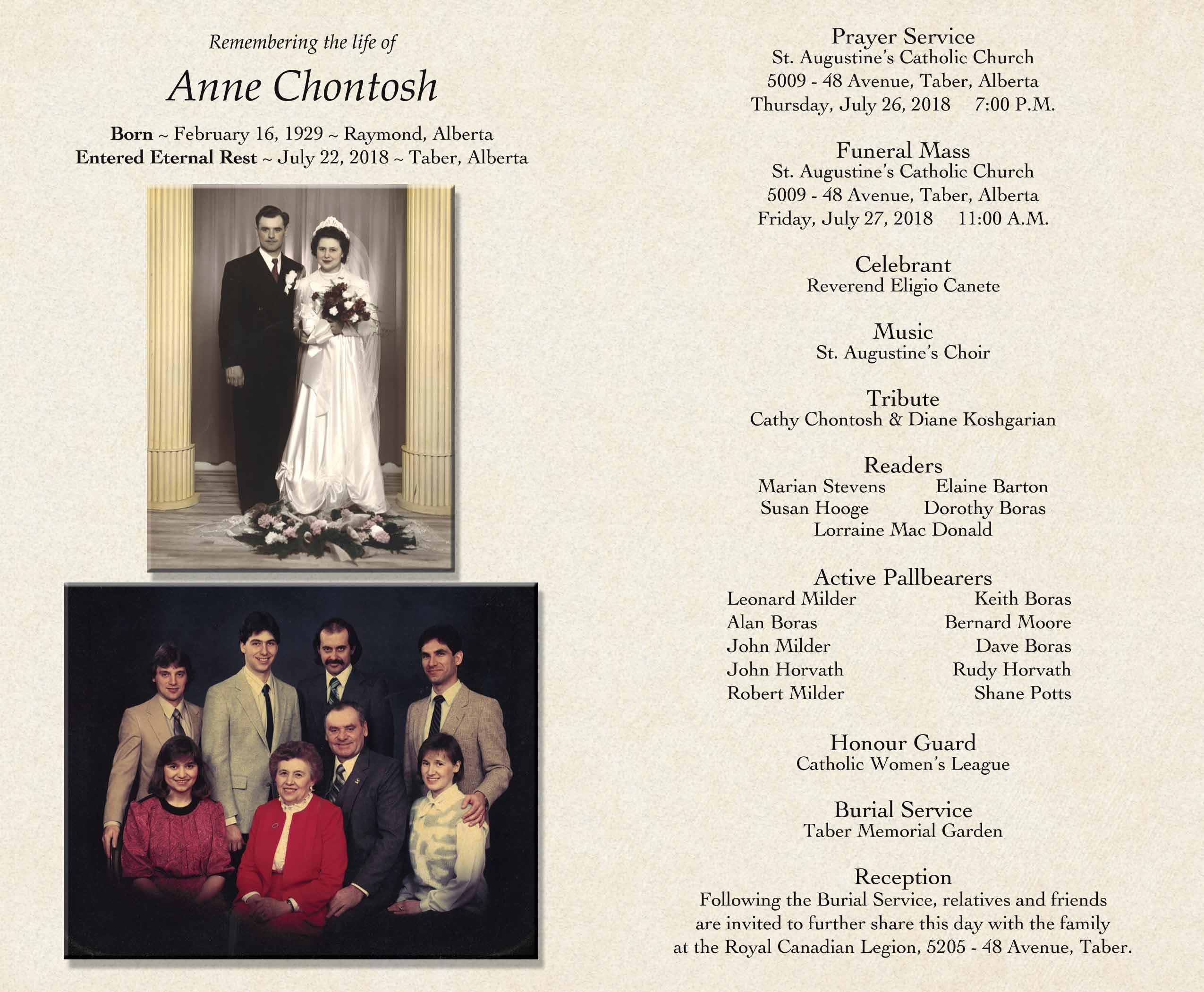The Funeral Mass was celebrated at St. Augustine's Catholic Church, 5009 - 48 Avenue, Taber on Friday, July 27, 2018 at 11:00 A.M. Burial followed at the Taber Memorial Garden.