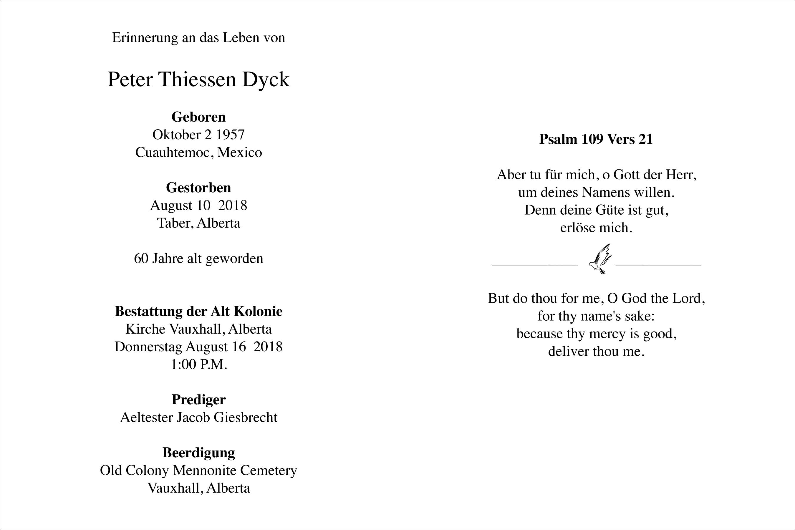 Peter Thiessen Dyck, beloved husband of Anna Dyck, passed away on Friday, August 10, 2018 at the age of 60 years.
