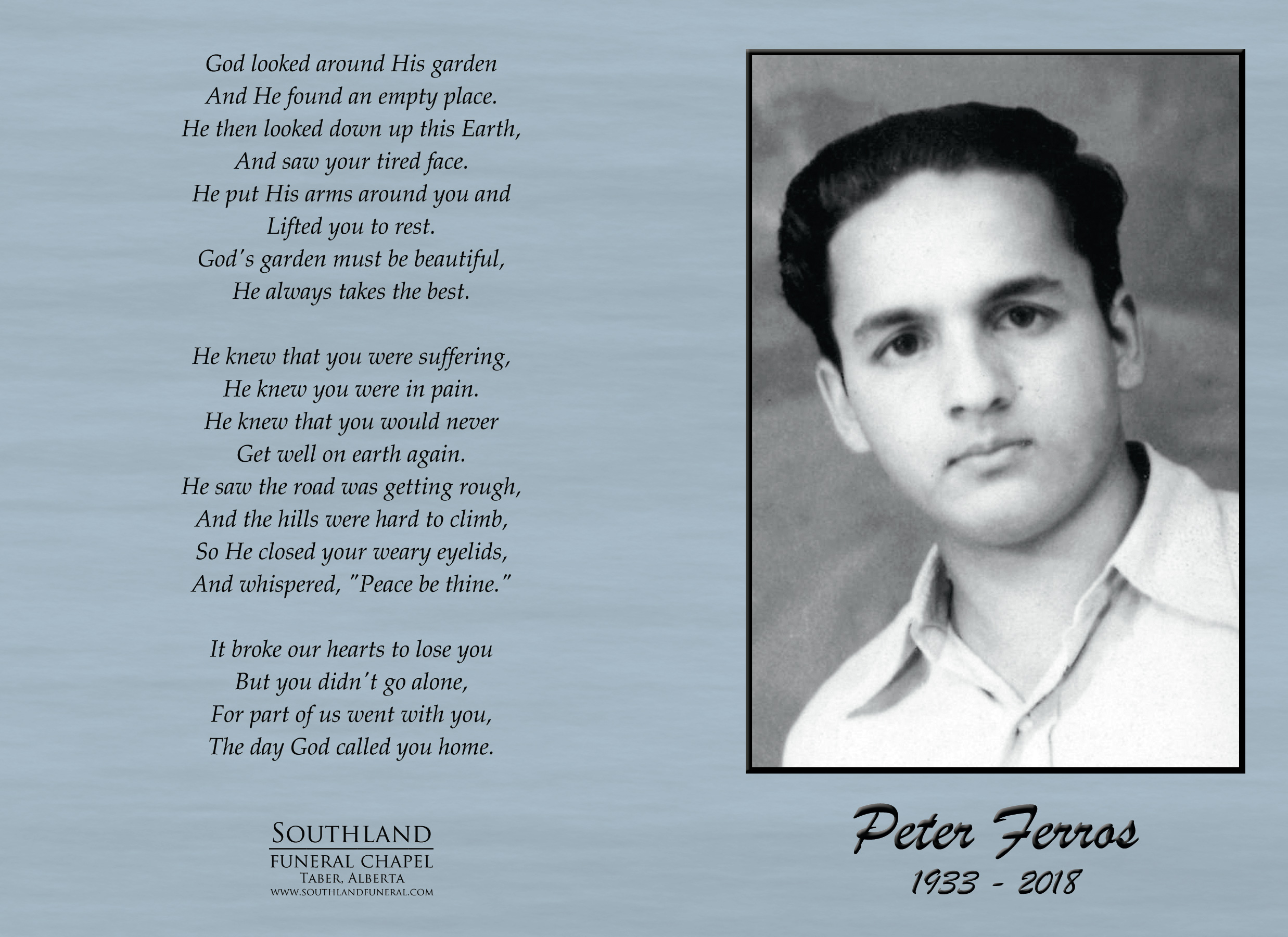 Peter Ferros, beloved husband of Clara Ferros, passed away peacefully in Taber on Monday, October 29, 2018 at the age of 85 years.