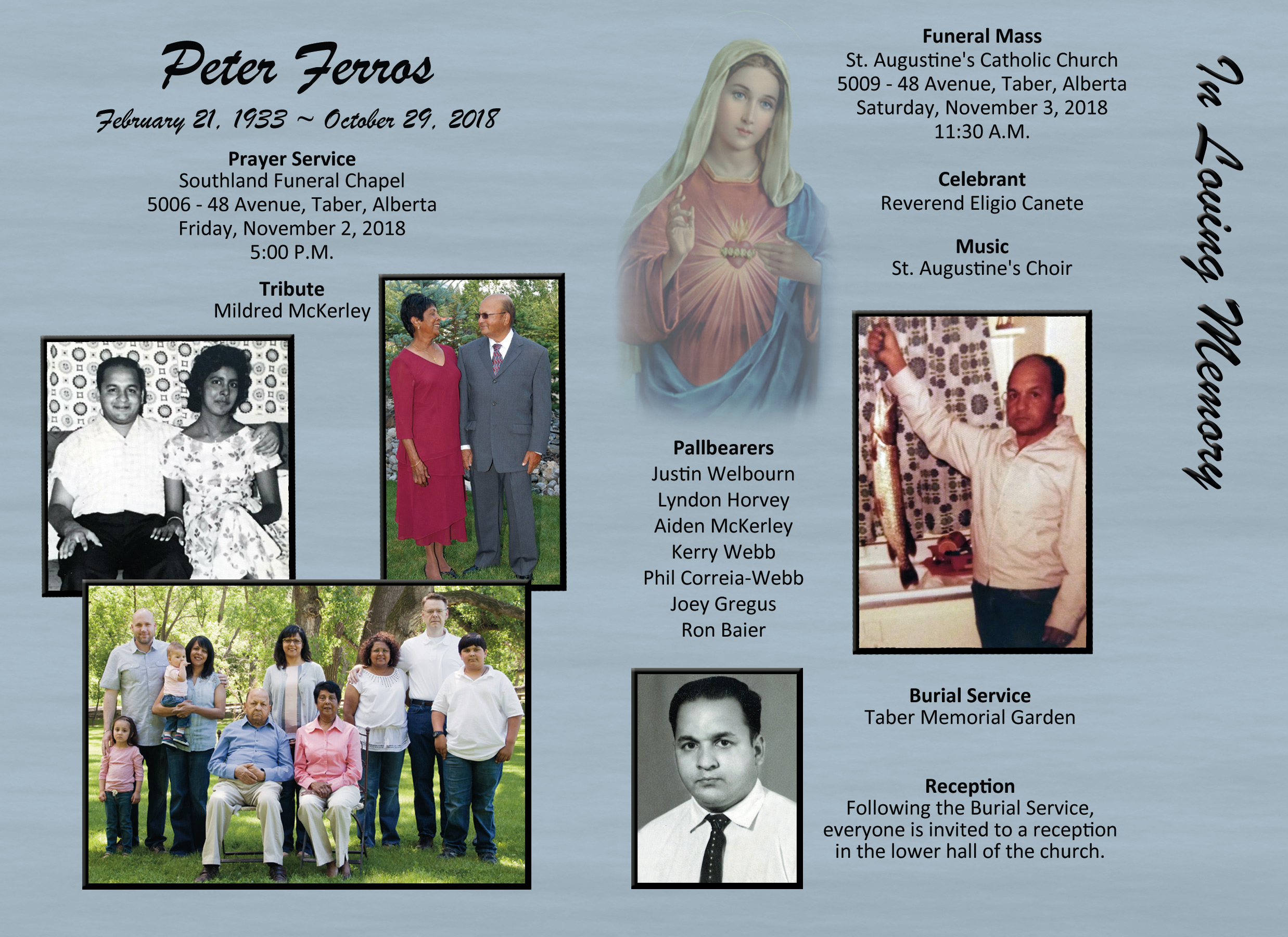 The Funeral Mass was celebrated at St. Augustine's Catholic Church, 5009 - 48 Avenue, Taber on Saturday, November 3, 2018 at 11:30 A.M. Burial followed at the Taber Memorial Garden.